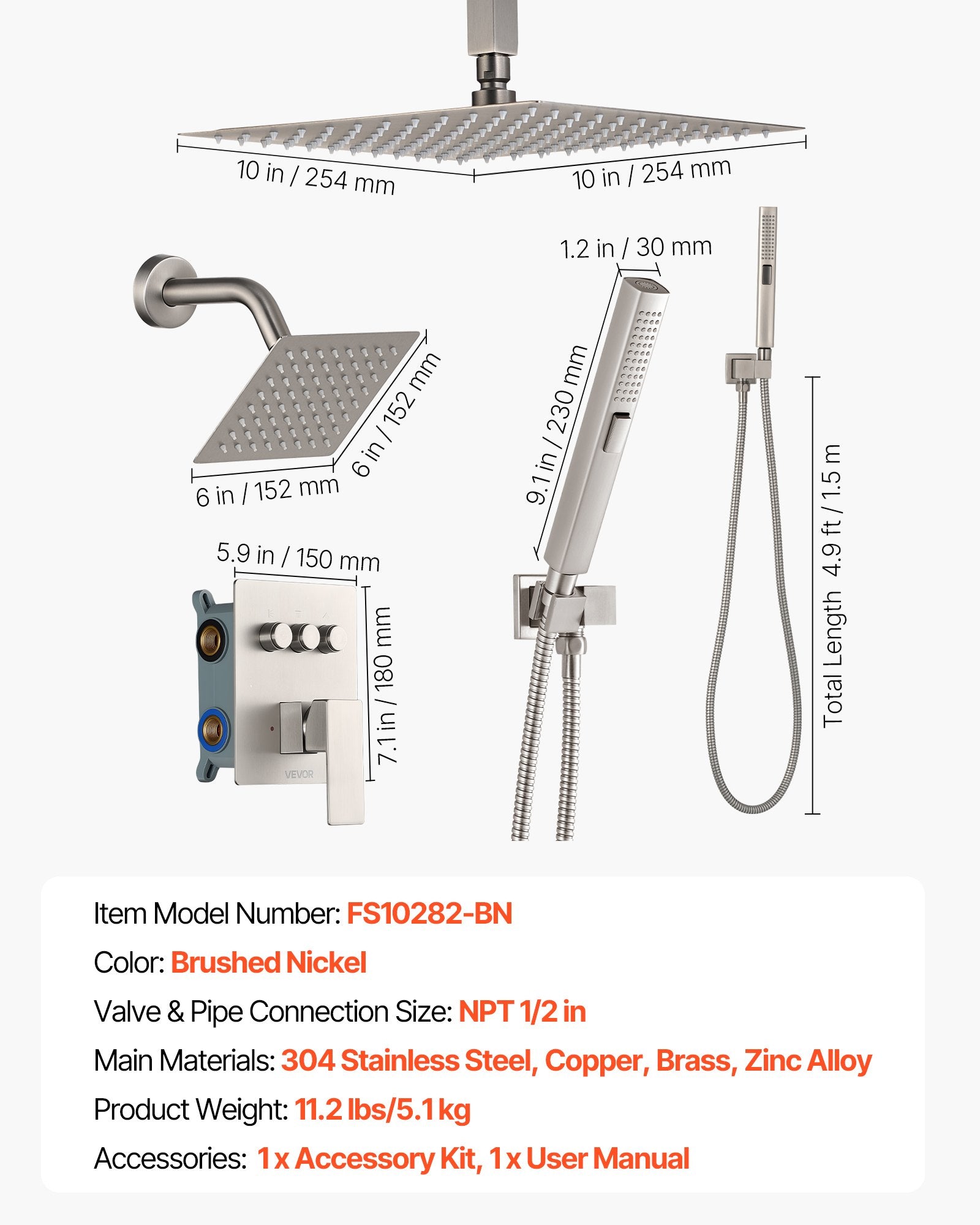 Shower Faucet Set, 10 Inch Ceiling Mount Rainfall Shower System with 6 Inch Wall Mount Head and 2 in 1 Handheld Spray, Rotatable 3-Function Dual Rain Head Brass Valve & Trim Kit, Brushed Nickel