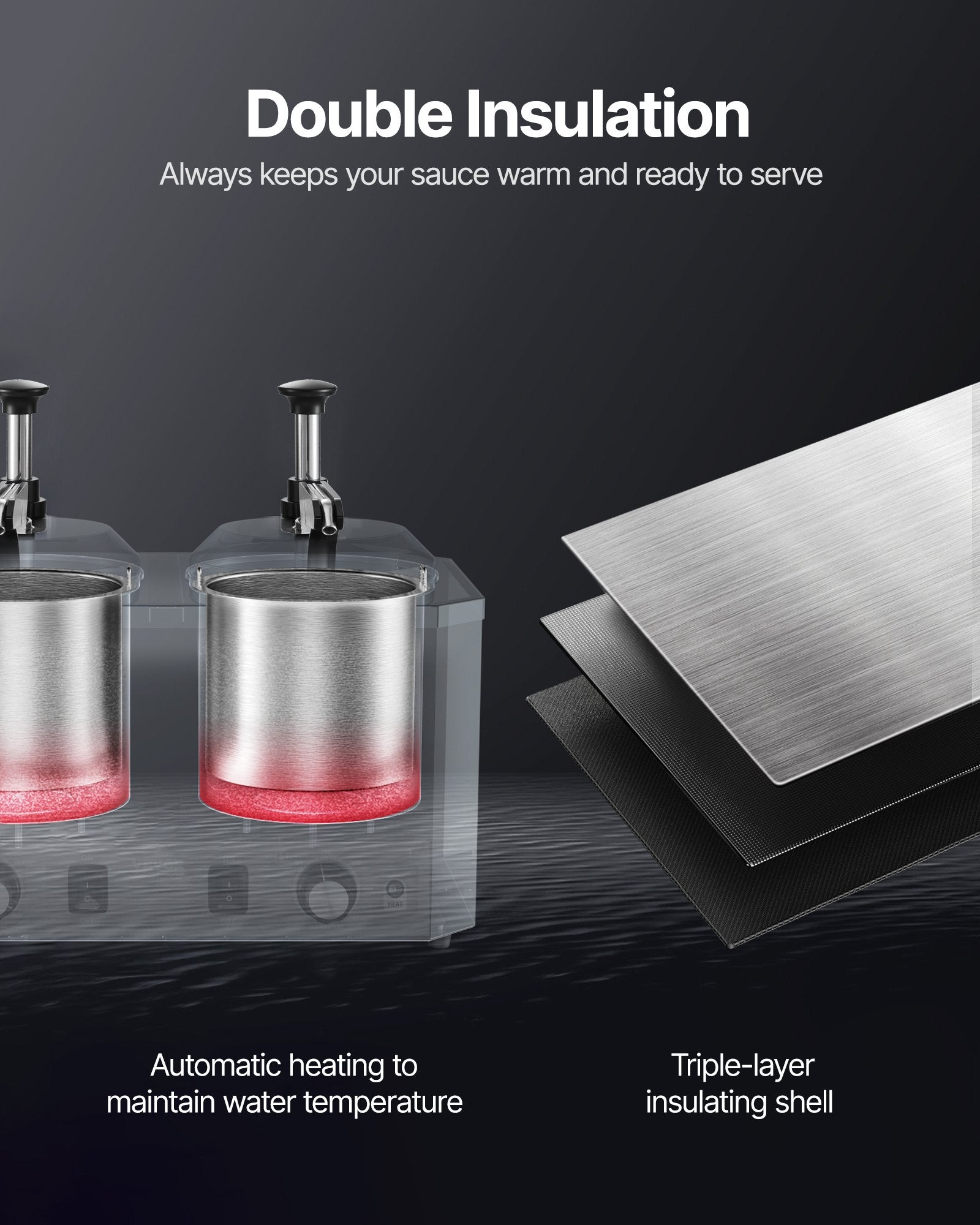 - High Capacity: With a food basin capacity of 2.4L/0.6 gal and a water tank capacity of 3L/0.8 gal, this commercial sauce warmer is sufficiently equipped to meet everyday demands. It allows you to heat or melt your choice of toppings