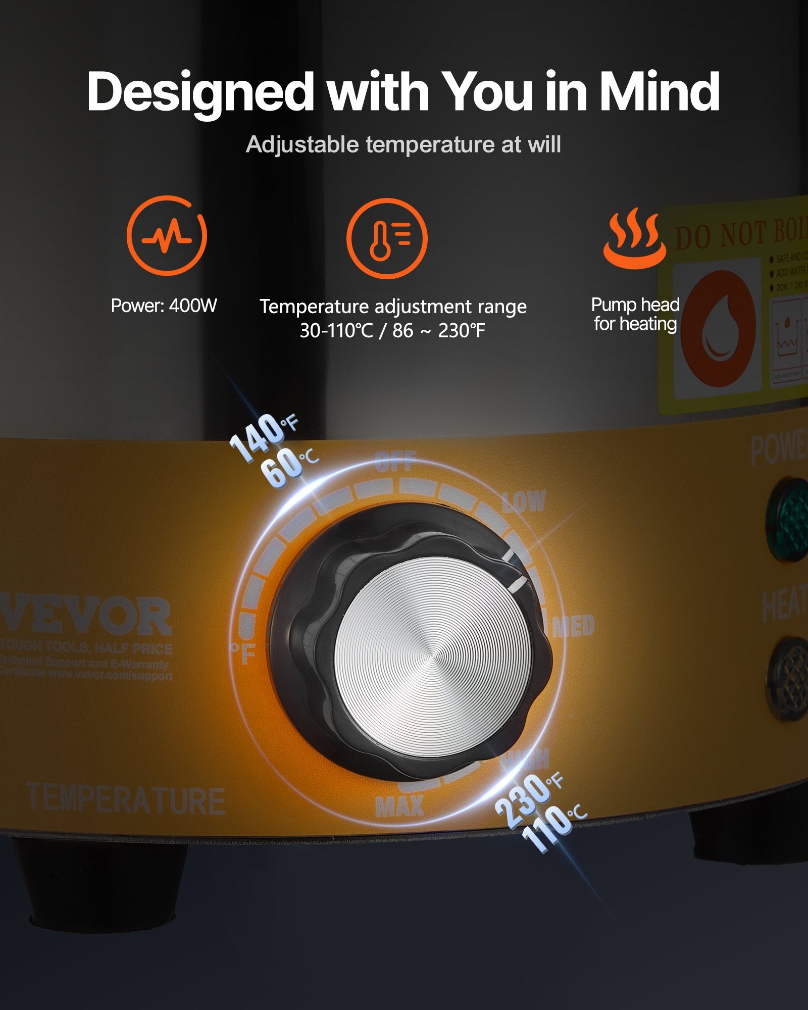 - Precision Temperature Control: The hot fudge warmer offers a wide range of temperature settings from 86℉-230℉ (30℃-110℃). Its powerful 400W ensures the water in the tank heats up swiftly to your chosen temperature