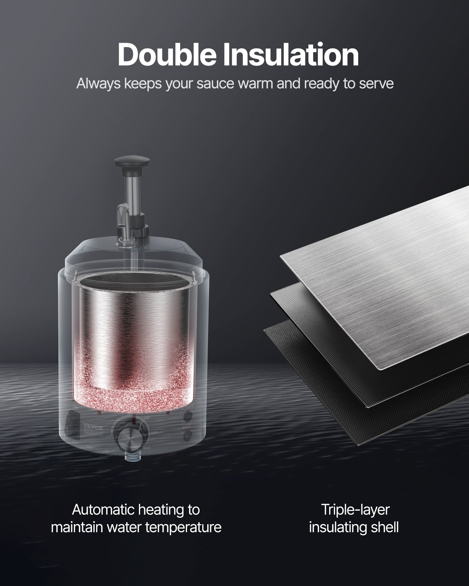 - High Capacity: With a food basin capacity of 2.4L/0.6 gal and a water tank capacity of 3L/0.8 gal, this commercial sauce warmer is sufficiently equipped to meet everyday demands. It allows you to heat or melt your choice of toppings