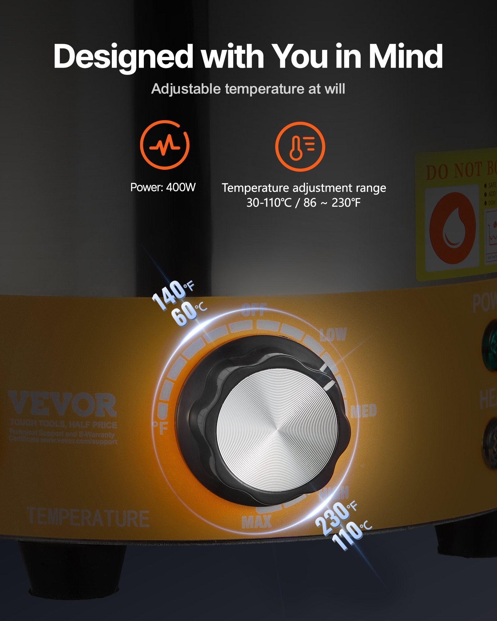 - Precision Temperature Control: The hot fudge warmer offers a wide range of temperature settings from 86℉-230℉ (30℃-110℃). Its powerful 400W ensures the water in the tank heats up swiftly to your chosen temperature