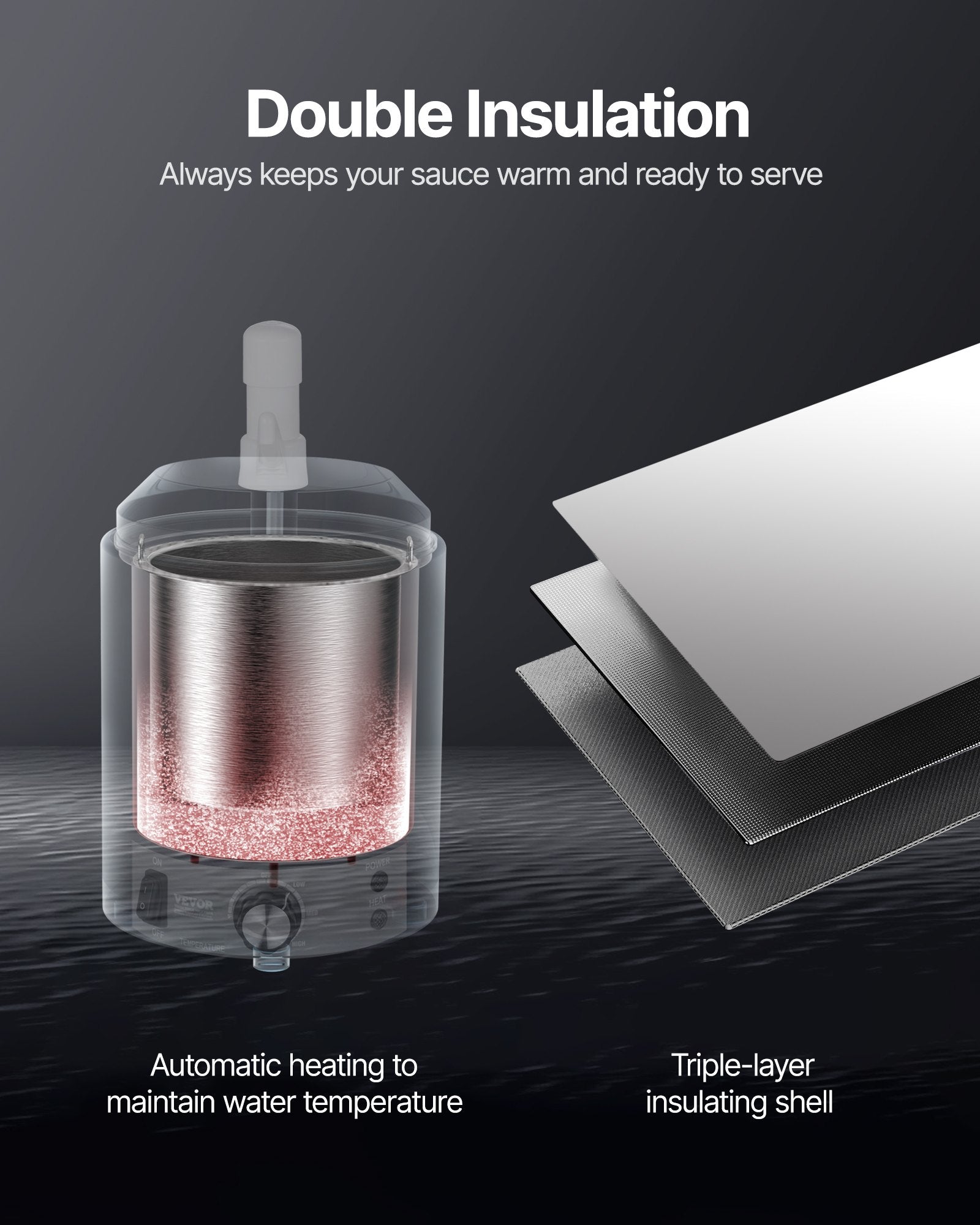 - High Capacity: With a food basin capacity of 2.4L/0.6 gal and a water tank capacity of 3L/0.8 gal, this commercial sauce warmer is sufficiently equipped to meet everyday demands. It allows you to heat or melt your choice of toppings
