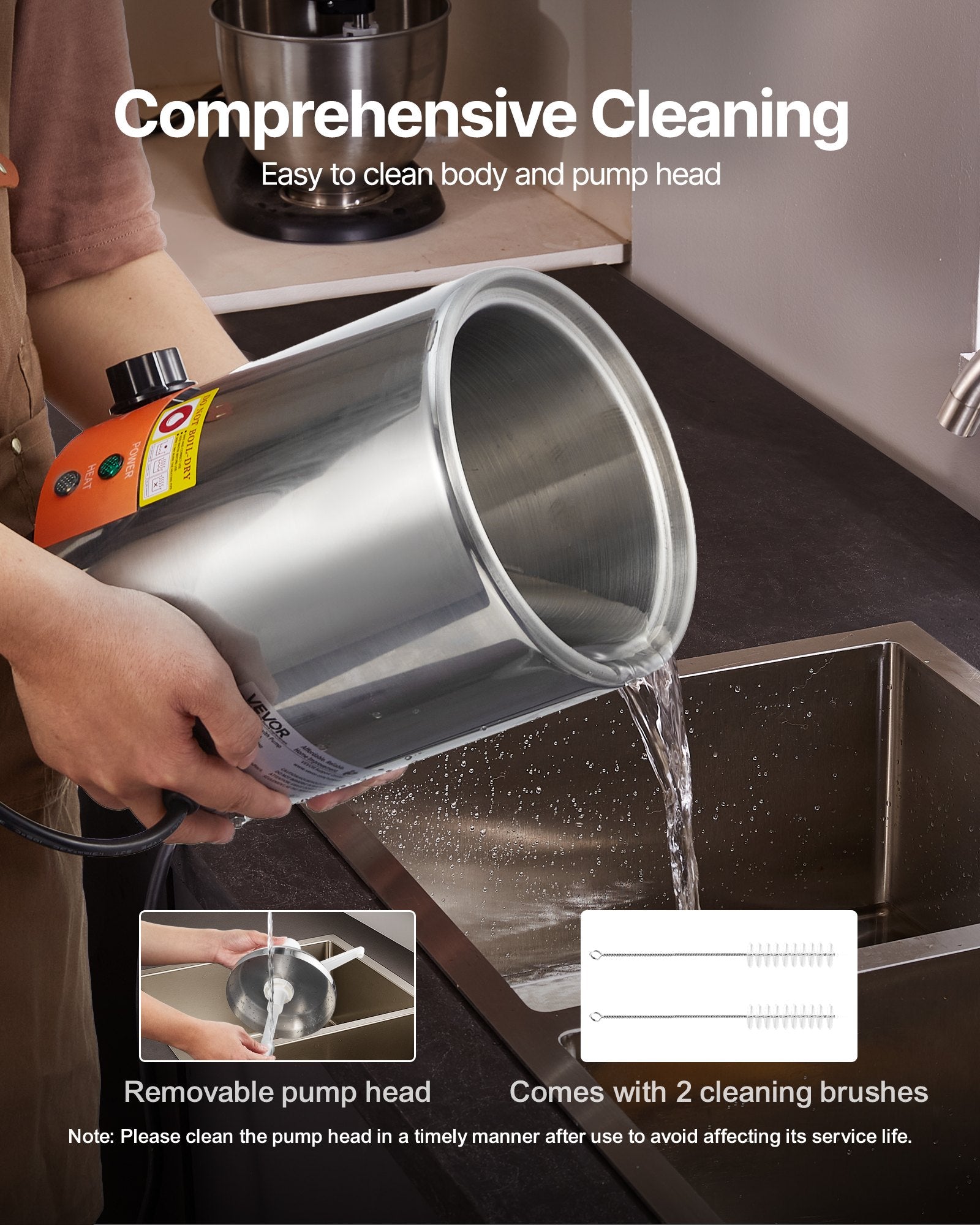 - Effortless Cleaning: The cheese sauce dispenser is designed with separate food and water basins, and a detachable pump head for cleaning ease. This design facilitates simple water refilling and draining, and ensures comprehensive cleaning