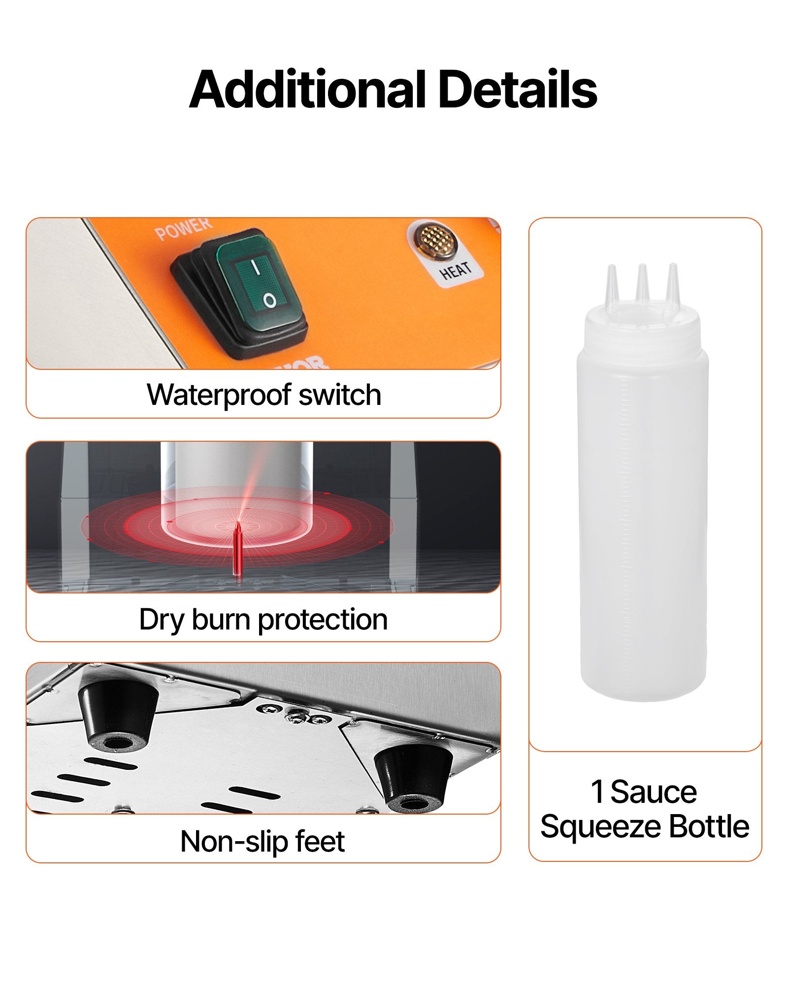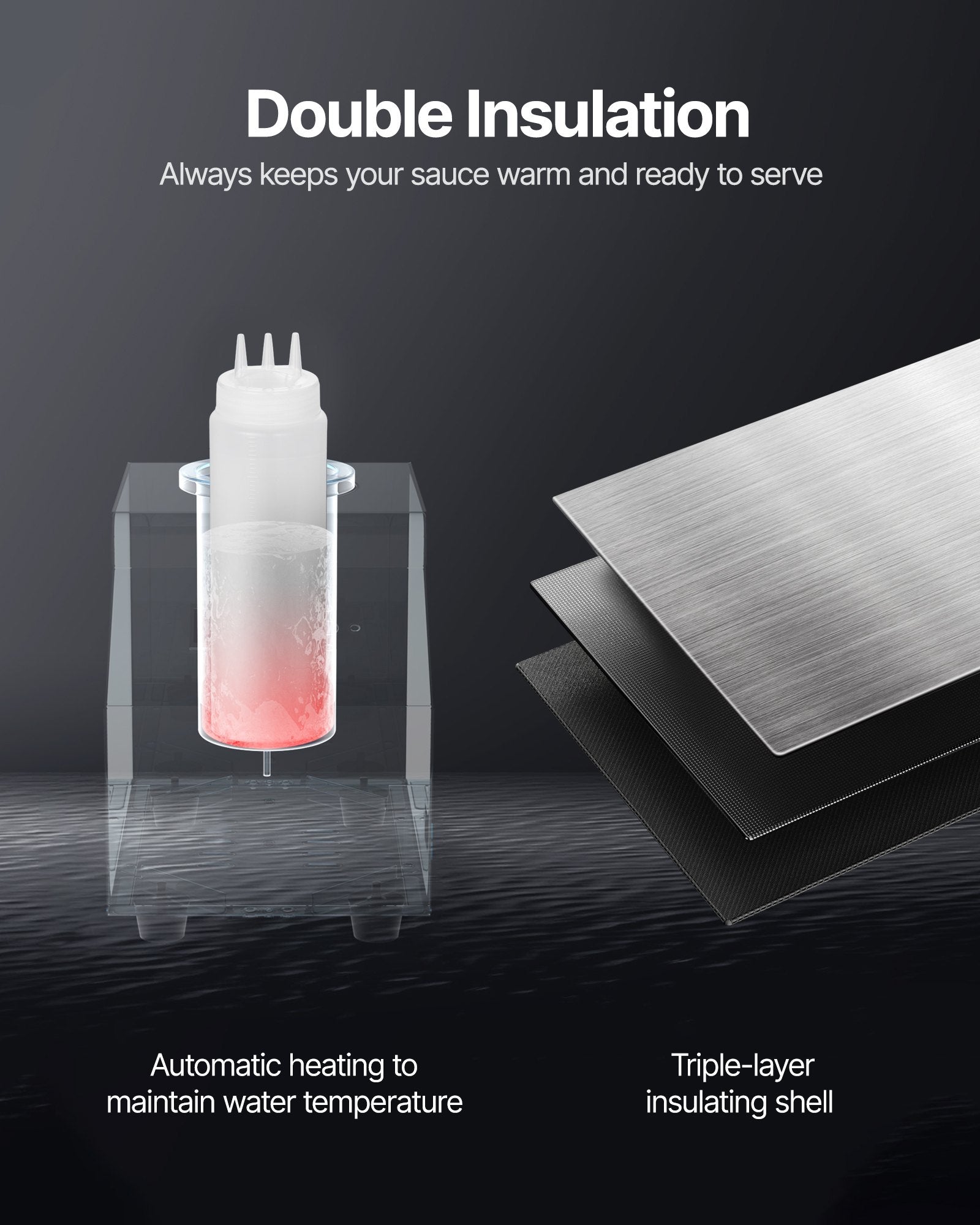 - High Capacity: With a water tank capacity of 0.8L/0.21 gal, this commercial sauce warmer is equipped to meet everyday demands. It allows you to heat or melt your choice of toppings, such as tortilla cheese, hot soft candies, and caramel