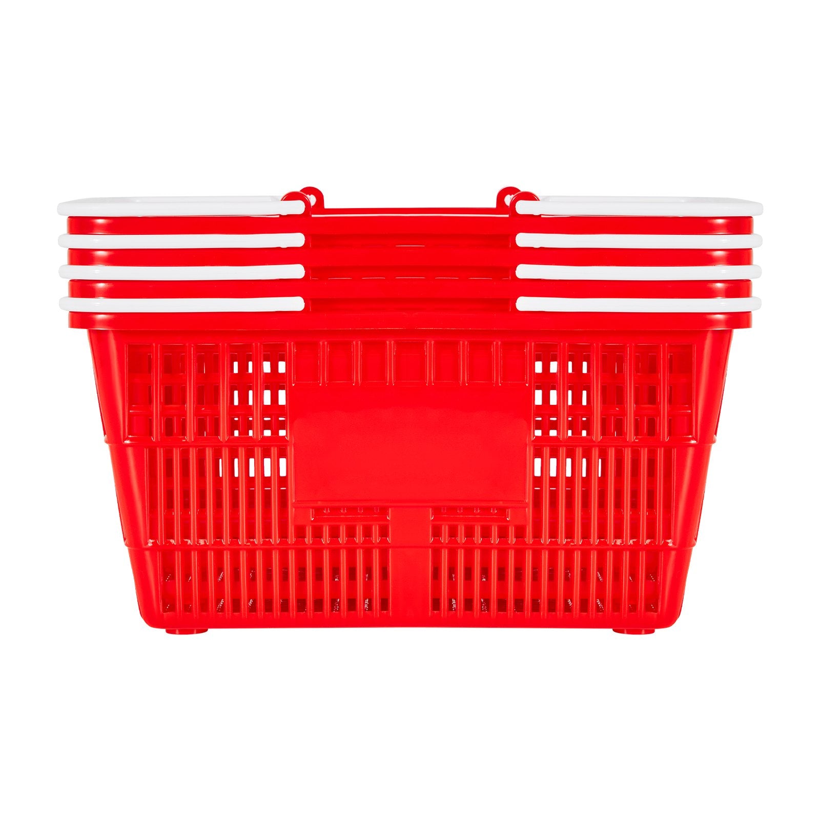 Shopping Baskets, 4 PCS, 21L Stackable PE Plastic Grocery Baskets with Handles, Dense Mesh Structure, Holds up to 20 lbs, Portable for Grocery, Retail, Stores, Supermarket, Home Use, Red