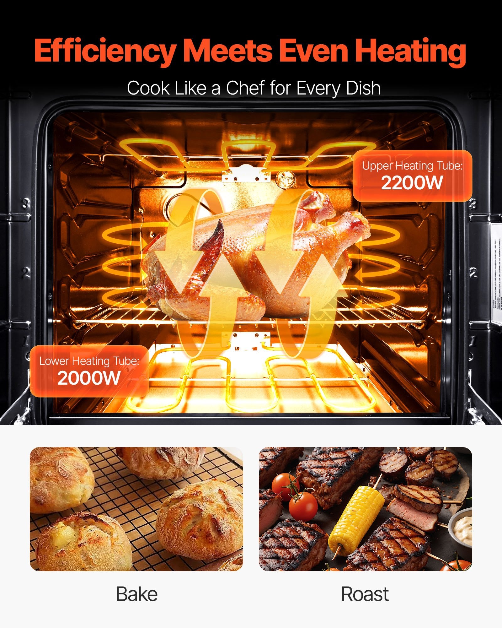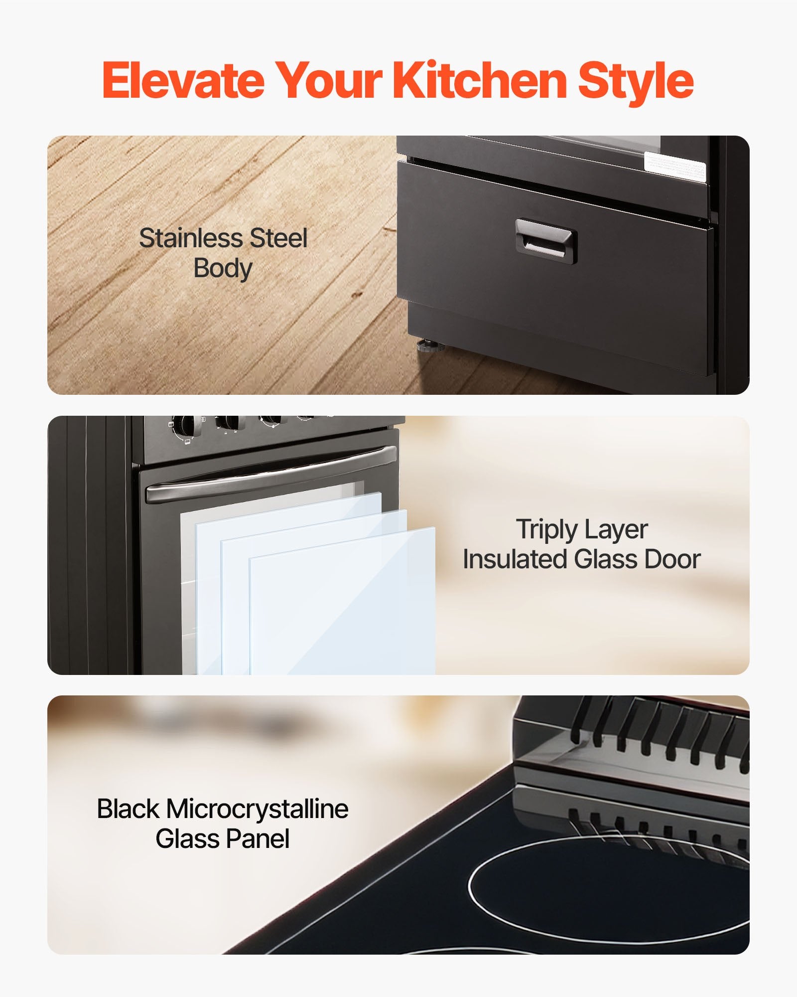 - Style That Elevates Your Kitchen: This electric oven combines a sleek stainless steel body with black microcrystalline glass for a clean, modern look. It's your powerful cooking tool, easy to wipe clean, and blends beautifully with any kitchen style