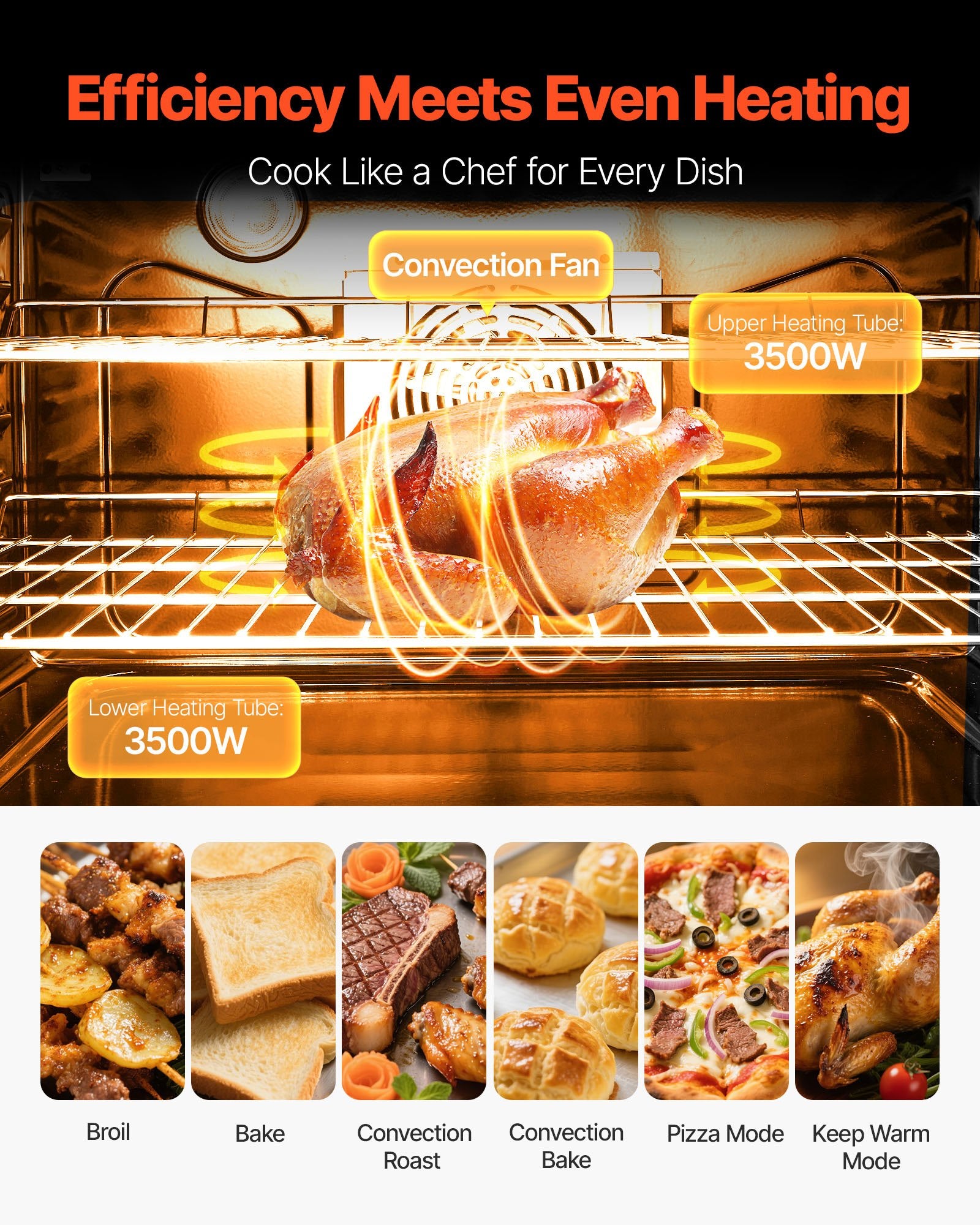 - Powerful, Fast-Heating Performance: This electric range features a convection fan for quiet, efficient cooking, dual oven elements (3500W/3000W), and 9600W cooktop power. It supports bake, broil, convection bake and roast, pizza and keep warm mode