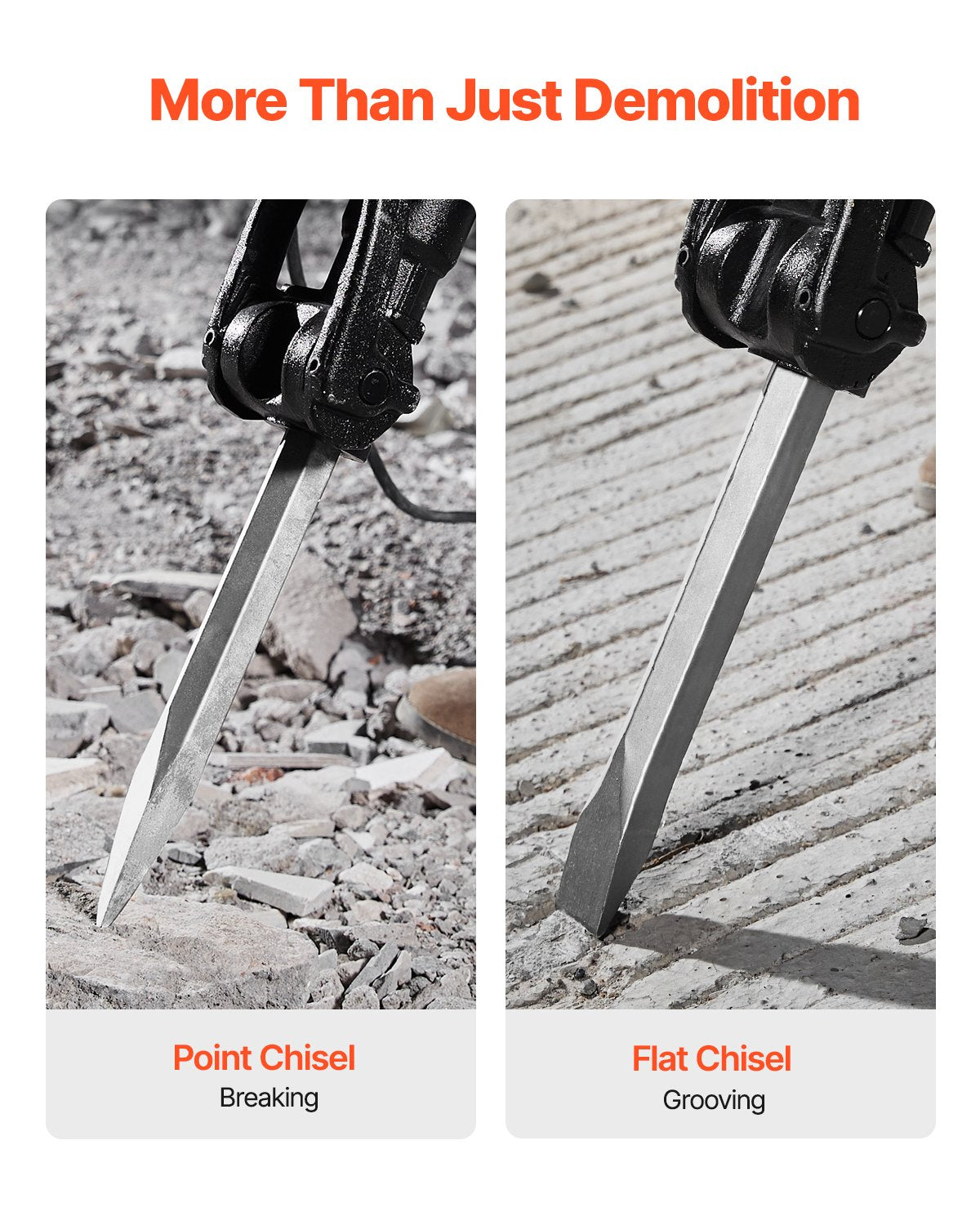 - Versatile Applications: Our demolition hammer comes with both pointed and flat chisels, allowing you to tackle hard concrete, solid masonry, or special plaster effortlessly. It is ideal for drilling, trenching, chipping, and demolition, this tool is your go-to assistant for a wide range of construction tasks.