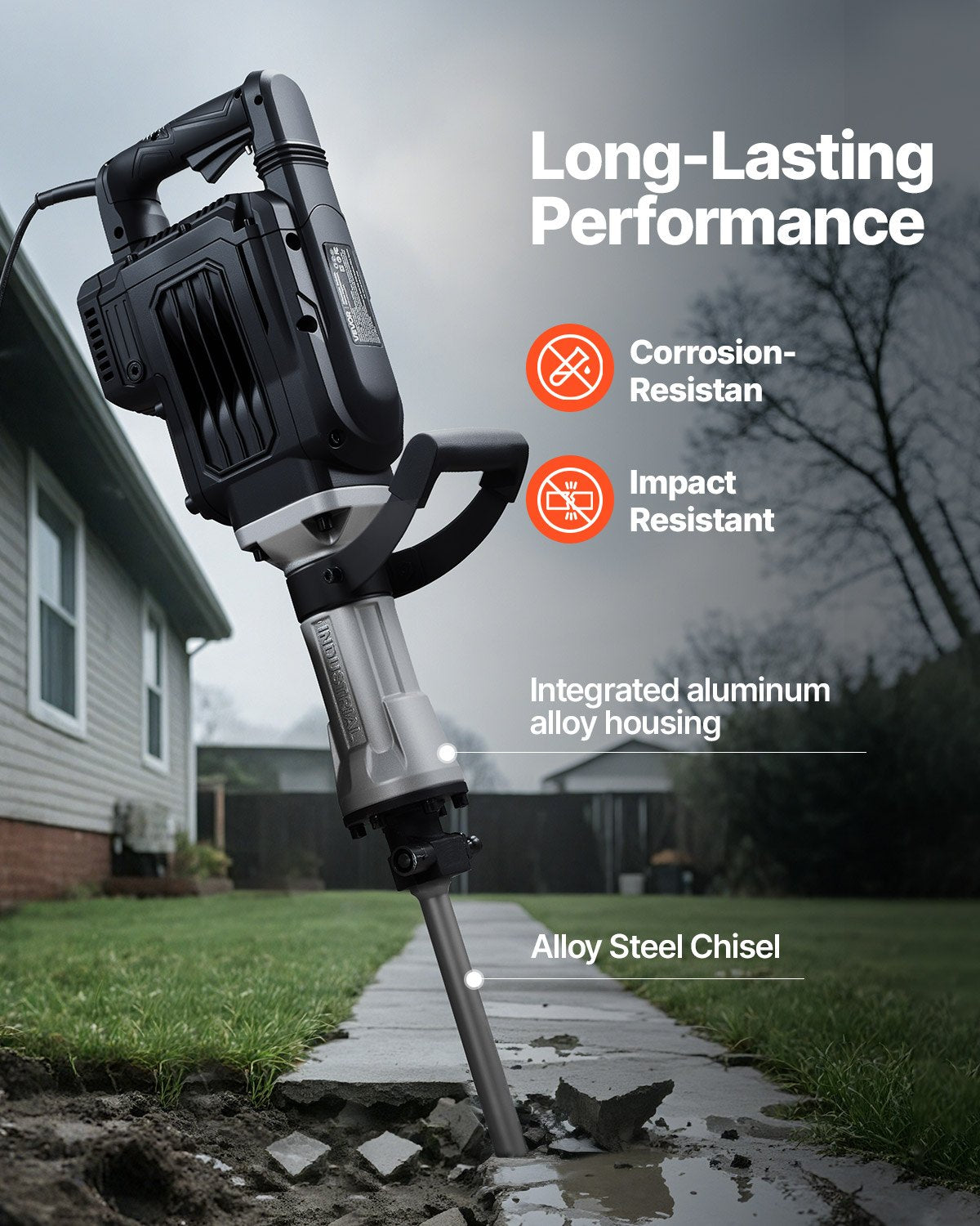 - Built to Last: Featuring a one-piece aluminum alloy housing, this demolition hammer is both lightweight and strong. Paired with alloy steel chisels, it withstands harsh job sites while minimizing wear
