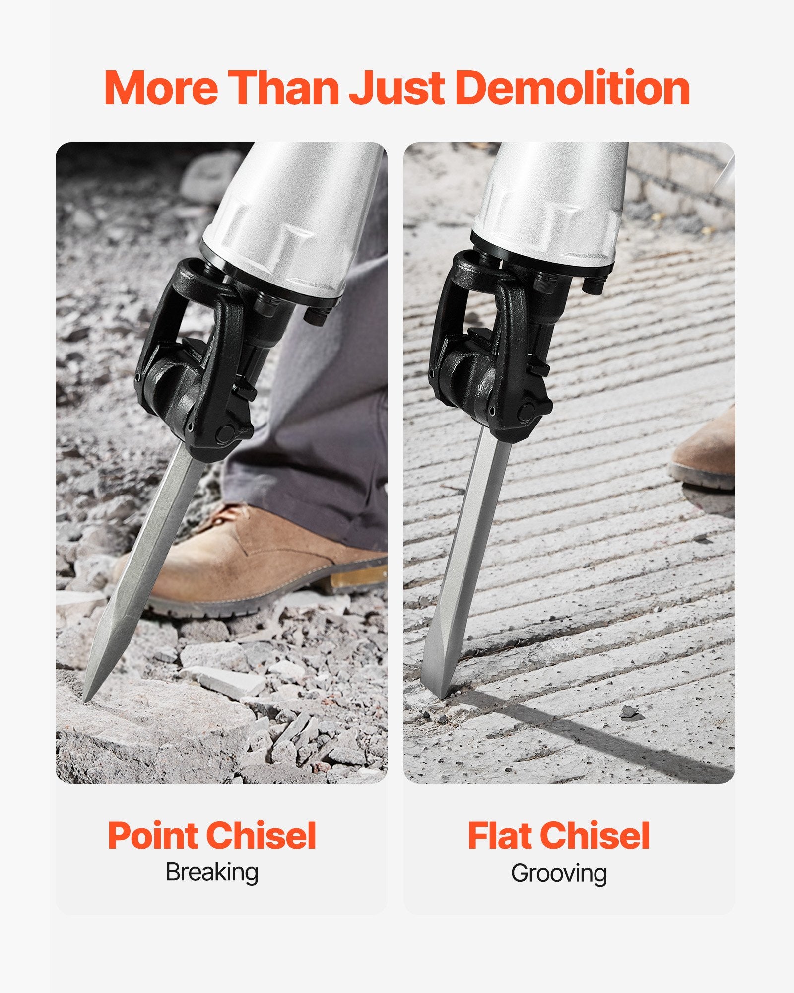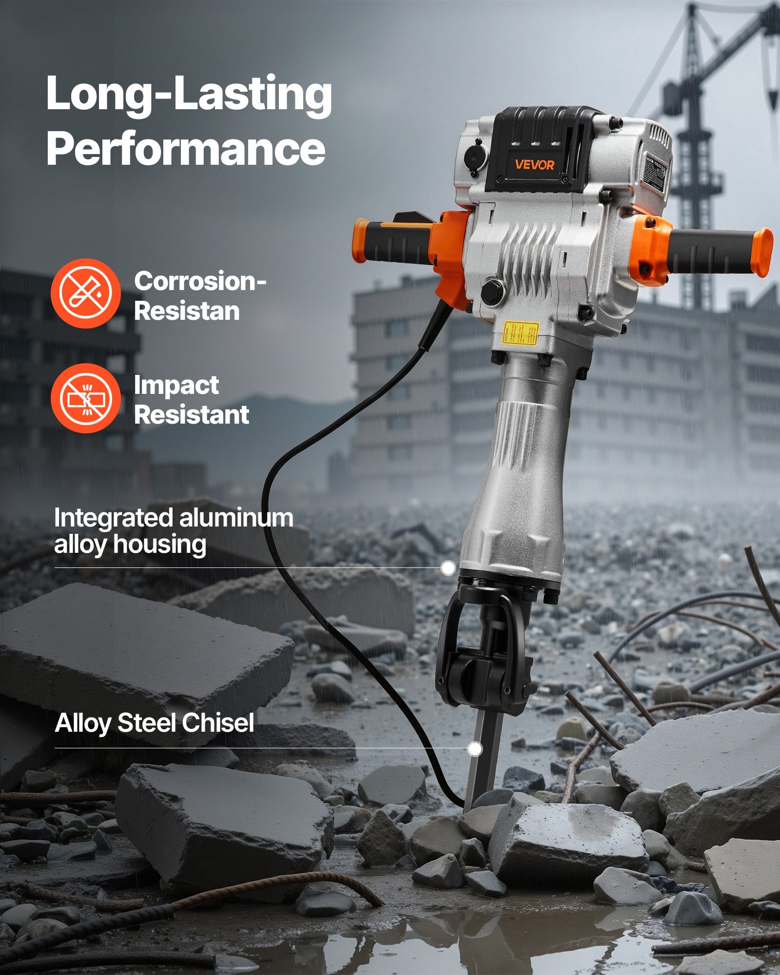 - Built to Last: Featuring a one-piece aluminum alloy housing, this demolition hammer is both lightweight and strong. Paired with alloy steel chisels, it withstands harsh job sites while minimizing wear