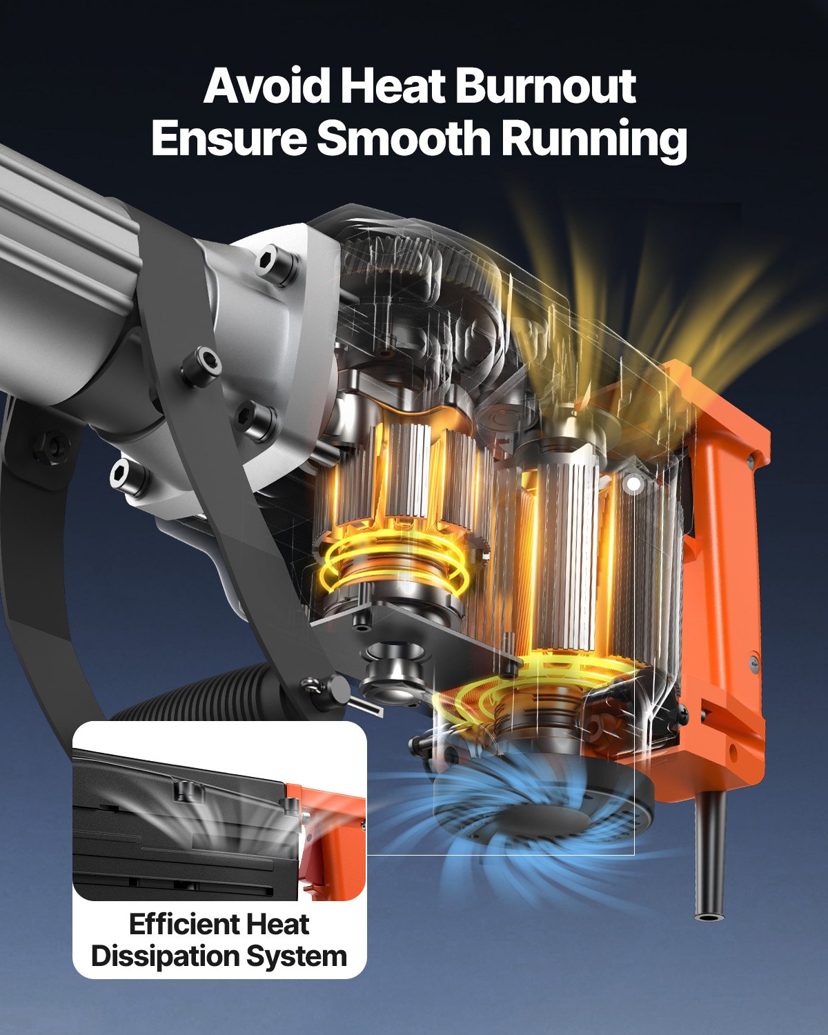 - Stays Cool During Intense Work: The efficient cooling system effectively cools the motor to improve the concrete breaker's life. The engine will be at low temperatures even after a long working time.