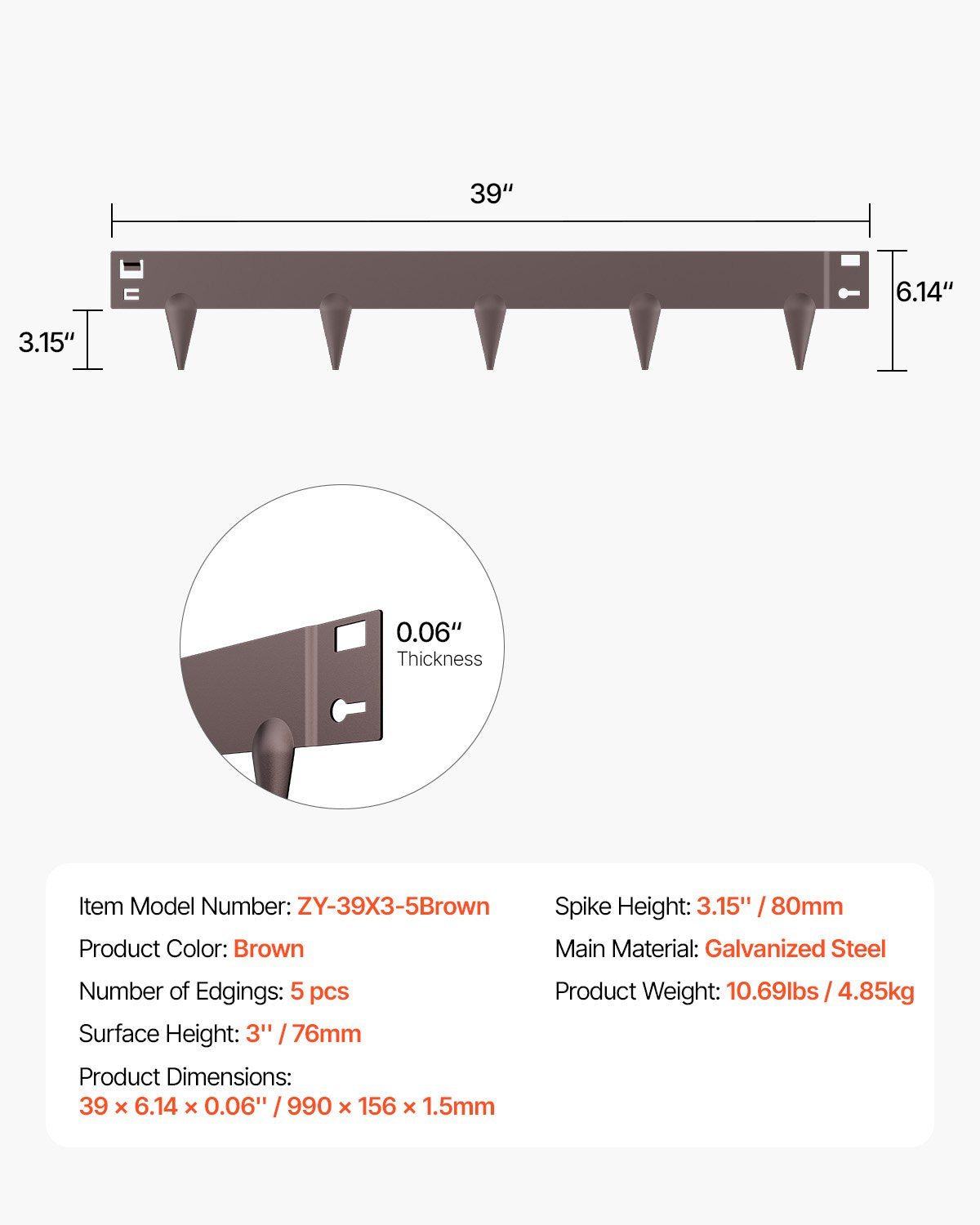 Steel Landscape Edging, 5 Packs 39 x 3 in Rust-Resistant Metal Landscape Edging, Bendable Garden Edging Border, Heavy Duty Lawn Edging, Easy-to-Install, Flower Bed Yard Pathway Divider Brown