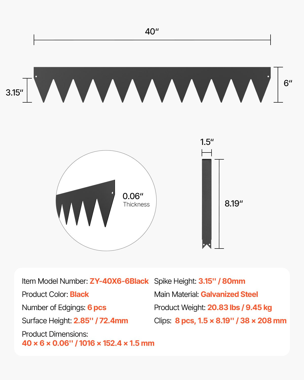 - What You’ll Receive: The set includes 6 metal yard edging, 1 pair of installation glove, 8 clips and 1 instruction manual. The extended spike design makes it easier to drive the pieces into the ground, reducing installation effort. Spend more time enjoying your outdoor space and less time on maintenance!
