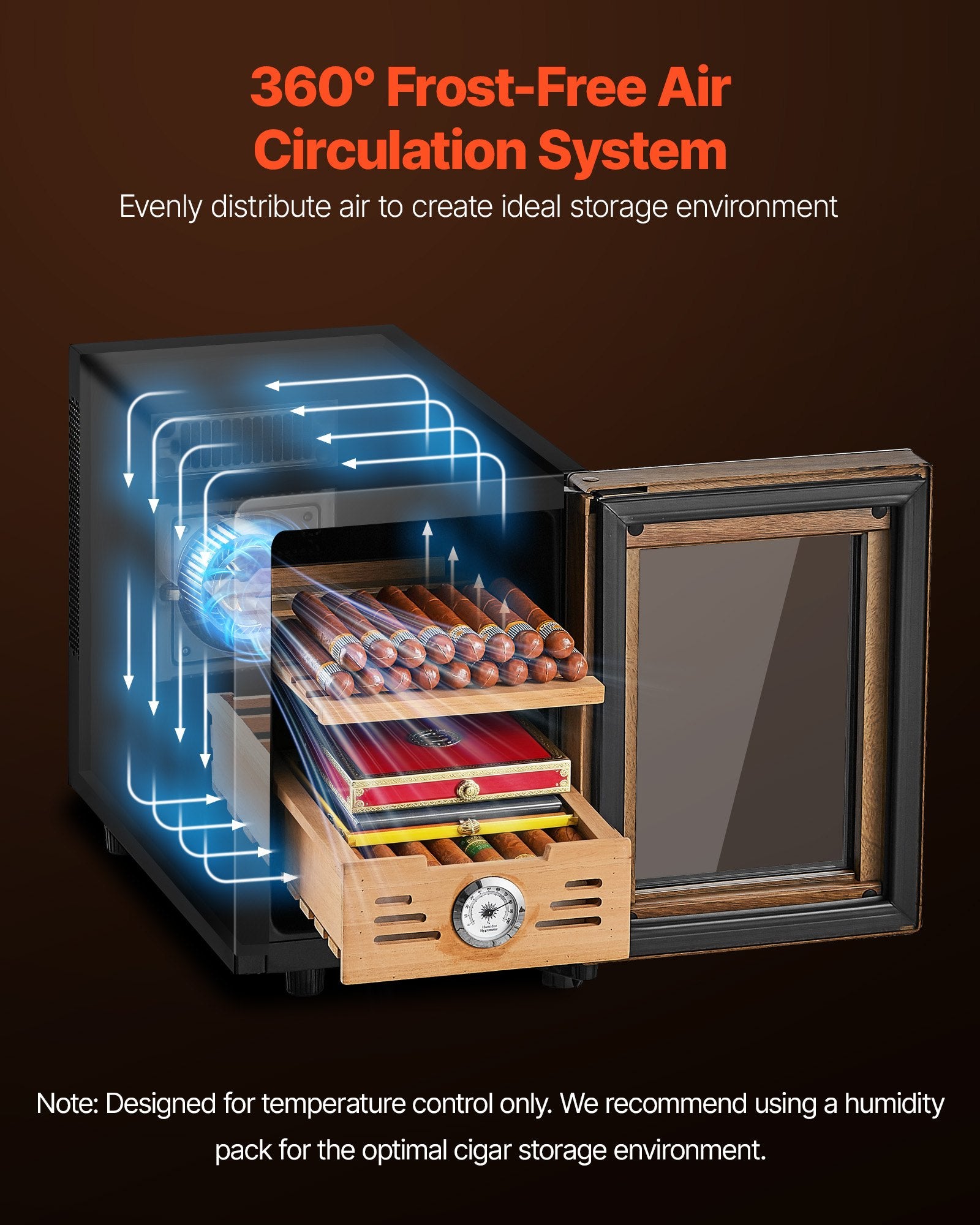 - 360° Frost-Free Air Circulation: With 360°circulating air-cooling system, you can enjoy even airflow throughout our electric cigar humidor to avoid frost and condensation buildup. Preserve the full flavor and quality of every cigar inside