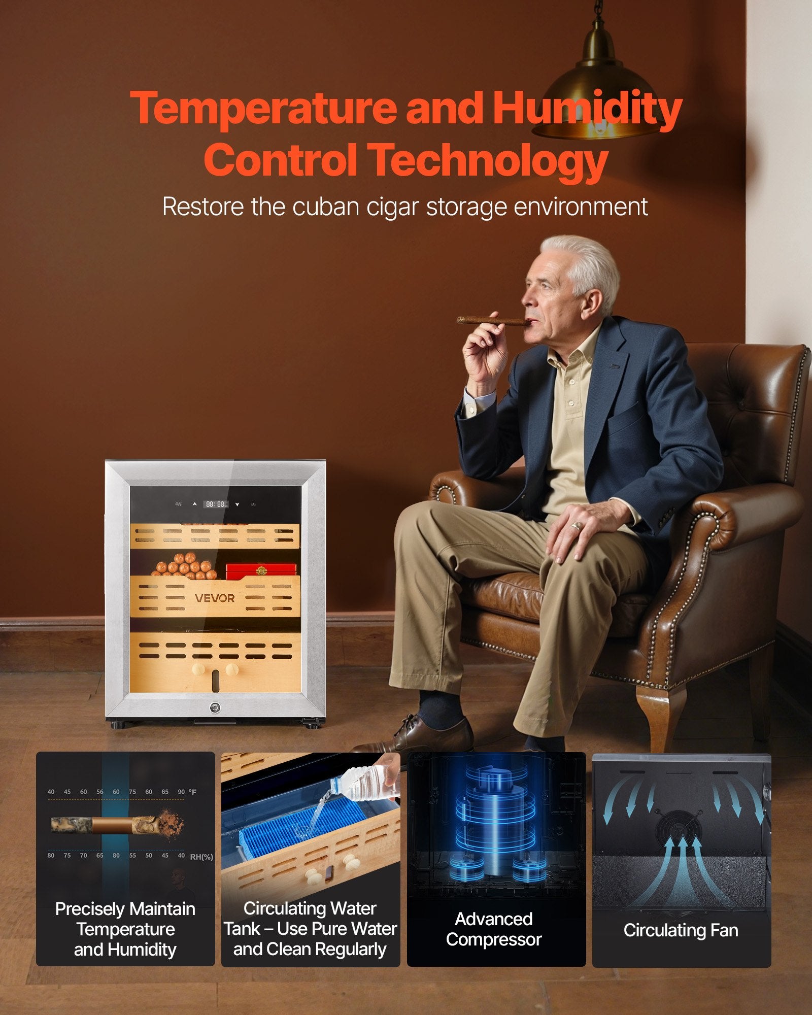 - Constant Temperature & Humidity: Equipped with a circulating water tank, high-performance compressor, and circulating fan, our electric cigar humidor evenly distributes warm and cool air, keeping your cigars in optimal preservation