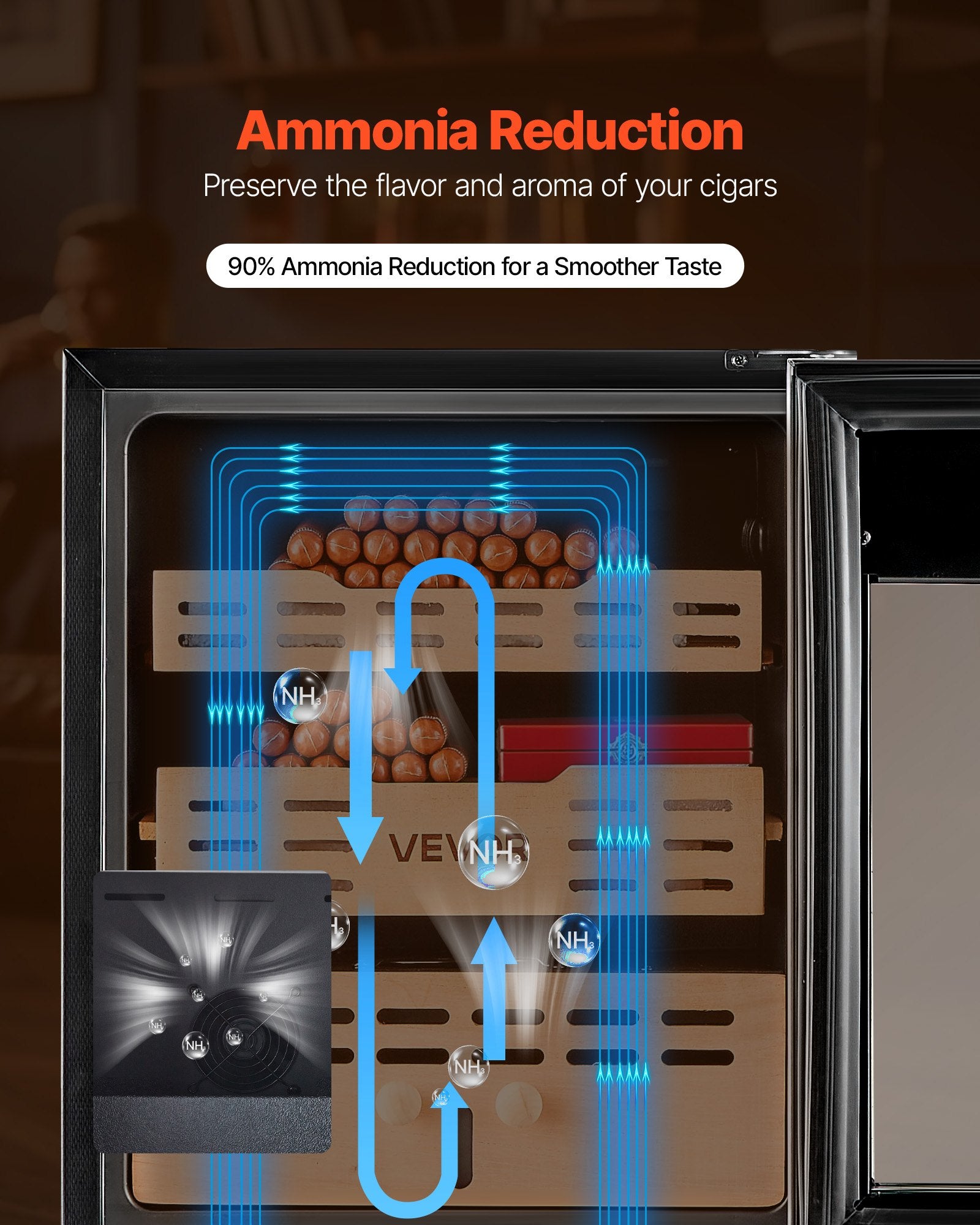 - Ammonia Odor Reduction: Equipped with an ion purification system, this electric cigar humidor cabinet quickly breaks down and reduces ammonia odors generated during storage, ensuring that every cigar retains its natural aroma and pure flavor