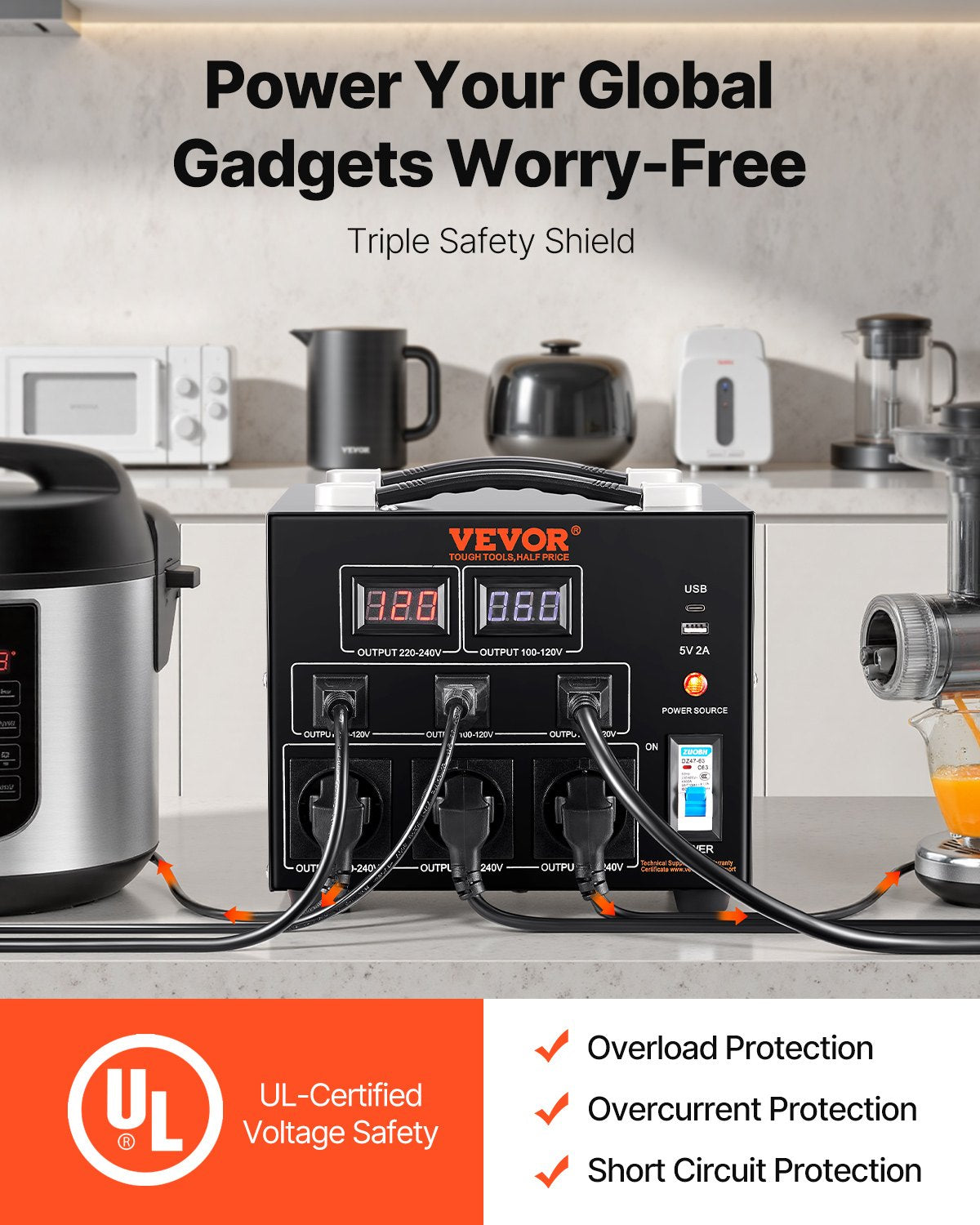 - 3000W Voltage Converter Transformer: This step up down transformer features 6 AC plugs, including 3 US NEMA 5-15R 3-Pin output sockets, 3 European Shucko output sockets, 1 5V USB port, and 1 Type-C jack. It is built with 2 LED displays showing the current output voltage in real-time to avoid transformer overload.