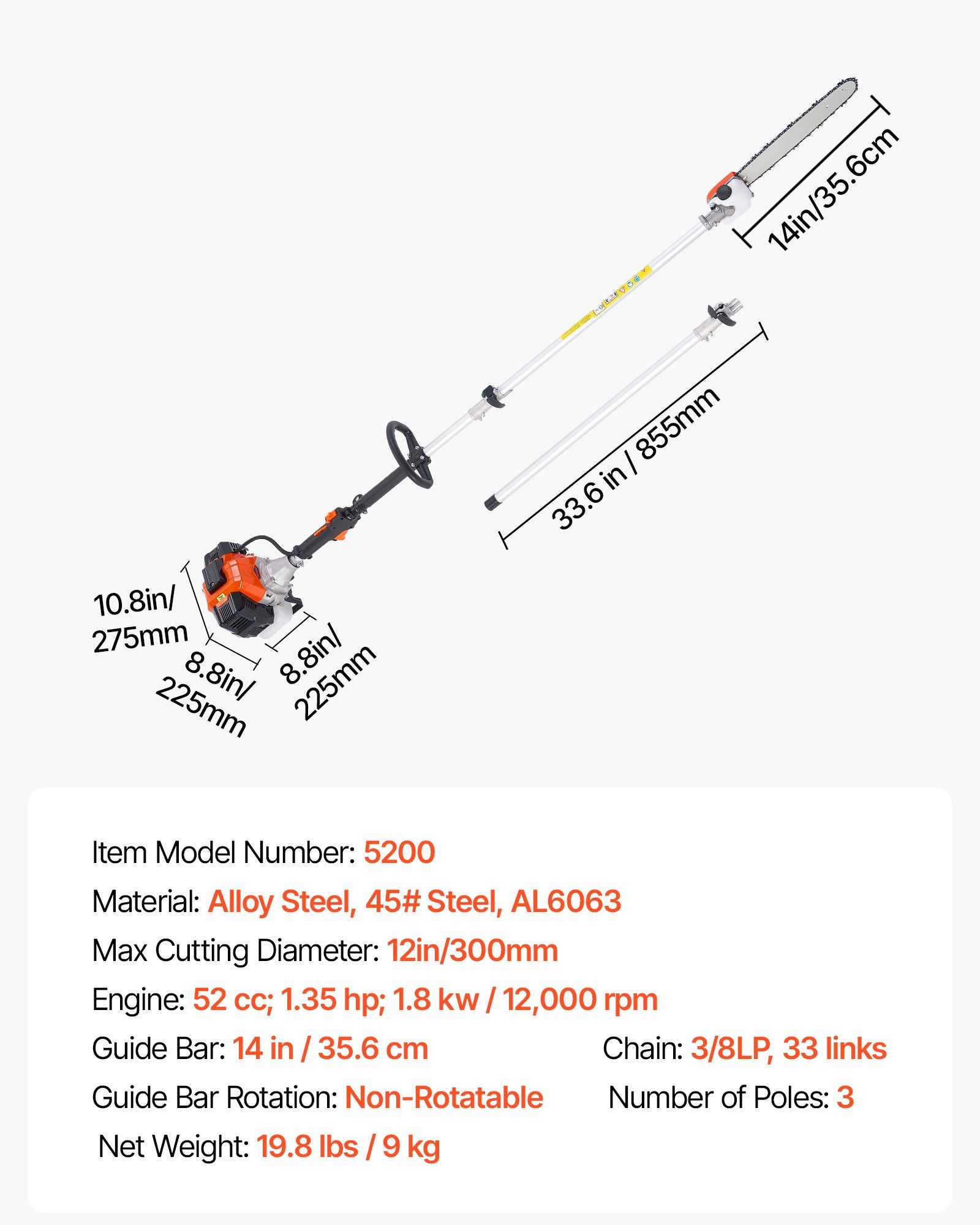 - Powerful Performance: Equipped with a 52 cc 2-stroke gasoline engine, the gas pole saw delivers 1.35 hp and reaching up to 12,000 RPM, perfect for quick branch cutting. The two 33.7 in (85.5 cm) extension rods extend from 7.2 ft (2.2 m) to 10 ft (2.94 m) to tackle branches at various heights with ease.