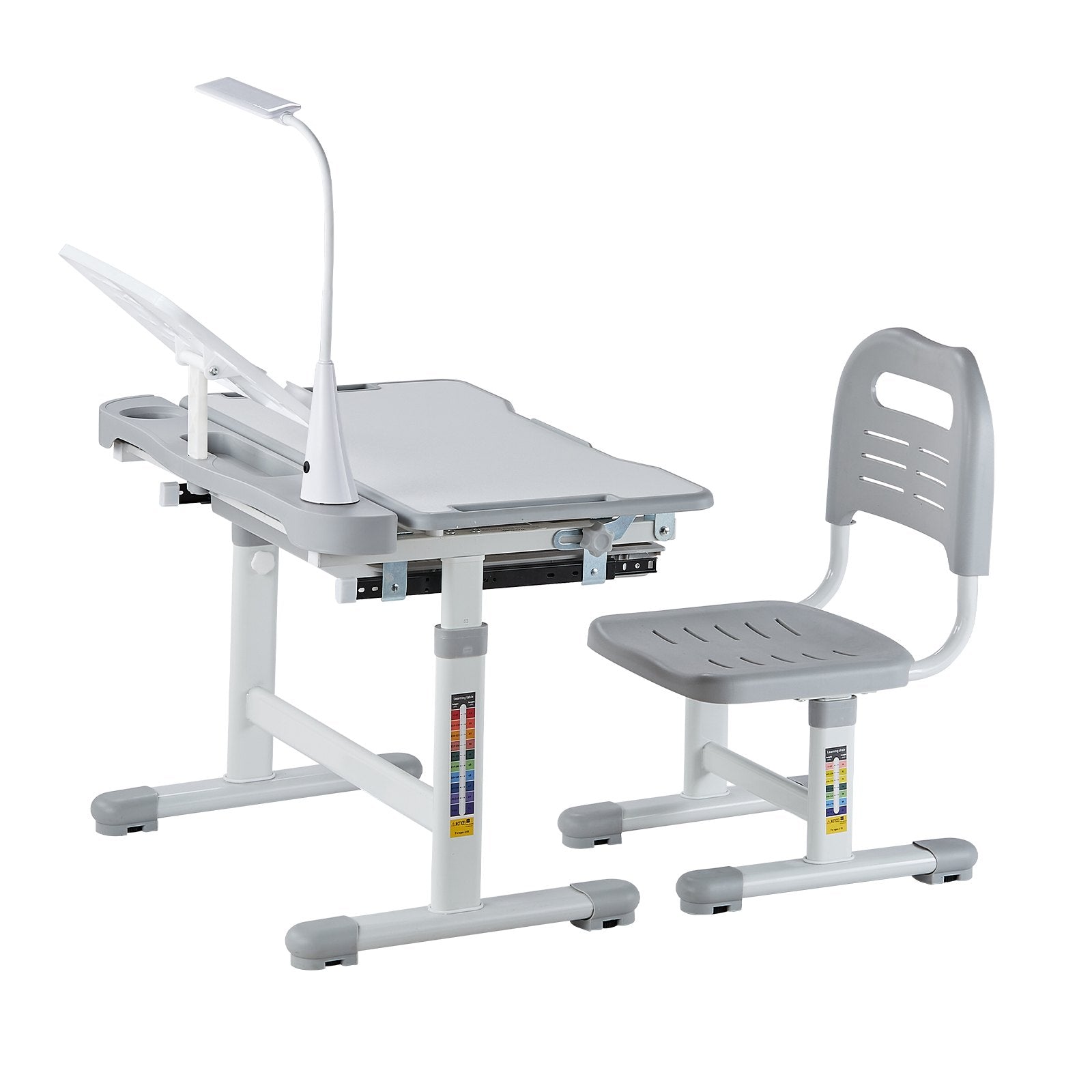 Kids Study Chair and Desk Set, Study Desk and Chair for Kids with Table Lamp, Adjustable Height & 0-40° Tilted Desktop Kids Desk and Chair, Children Study Table for Bedroom & Study Room, Grey