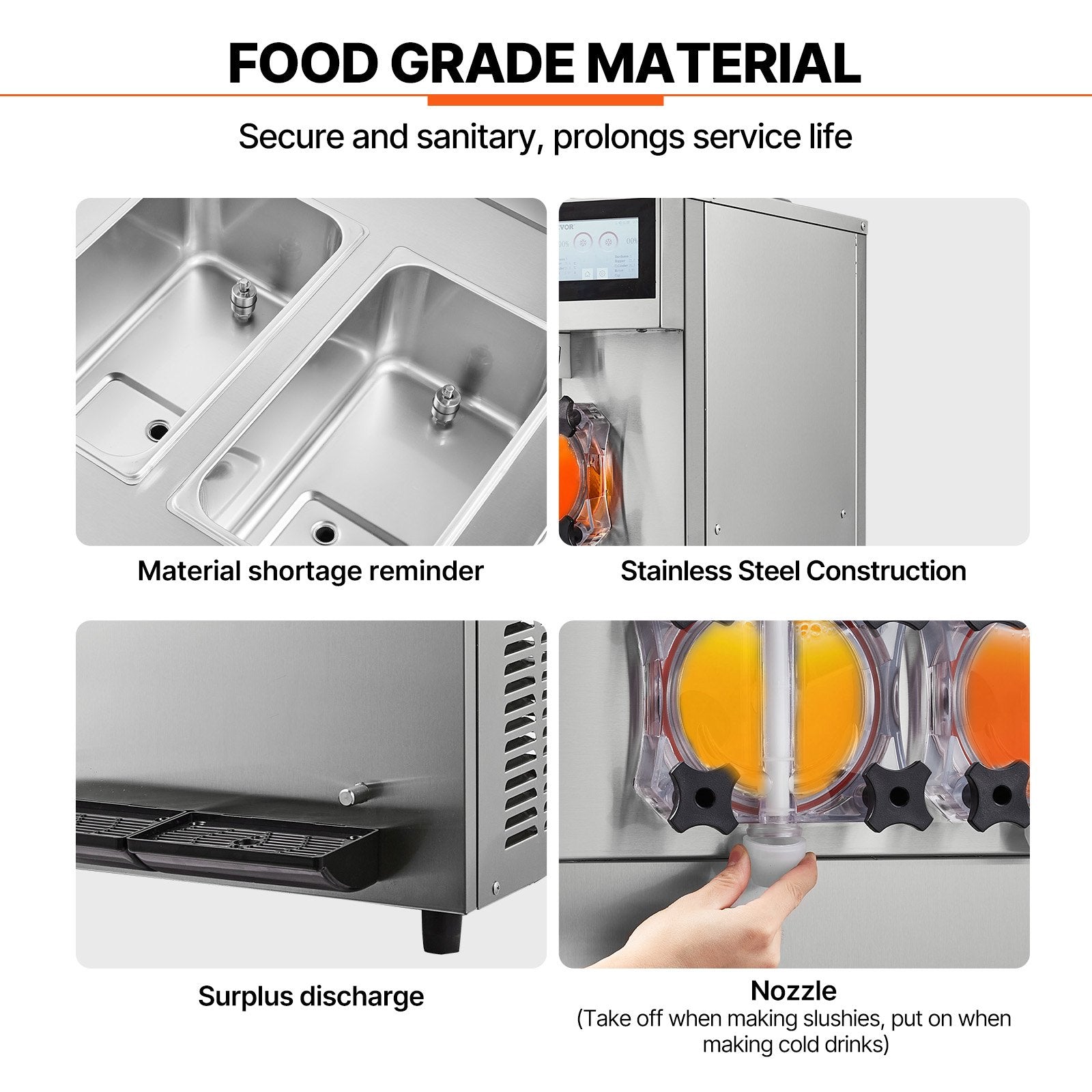 - Quality that Can't be Beaten: The entire slushy machine is made of high-quality stainless steel, which has excellent corrosion and rust resistance, withstand high pressure and is easy to clean. The ingredient tank and cooling tank are specially made with food-grade 304 stainless steel material. There is a small hole in the body for discharging the remaining ingredients to avoid clogging.