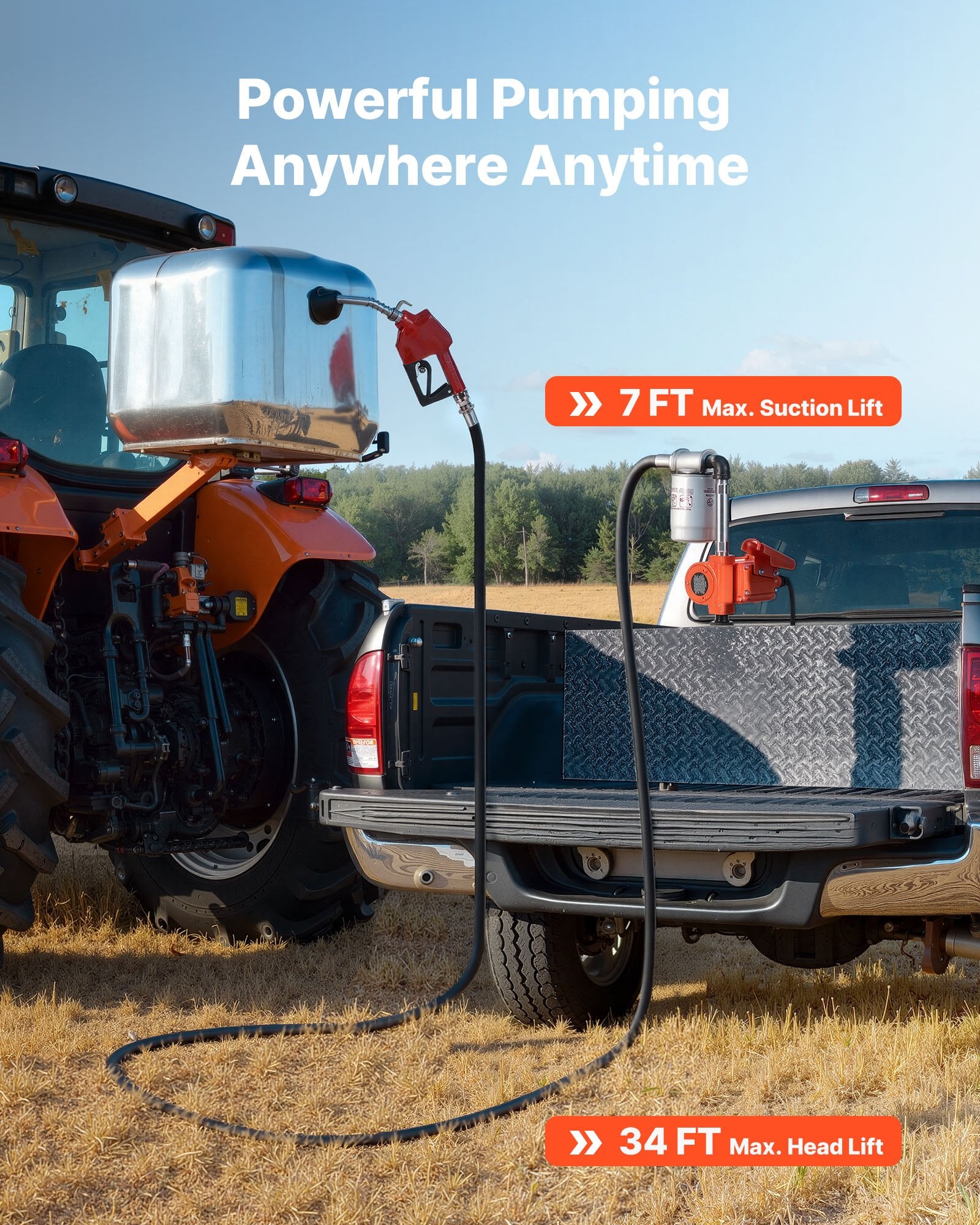 - Efficient Fuel Delivery: Delivers up to 10 GPM with a 4300 RPM motor, 34 ft max head lift, and 7 ft suction lift. Our 12V fuel transfer pump handles gasoline, diesel, and kerosene for fast, versatile transfers