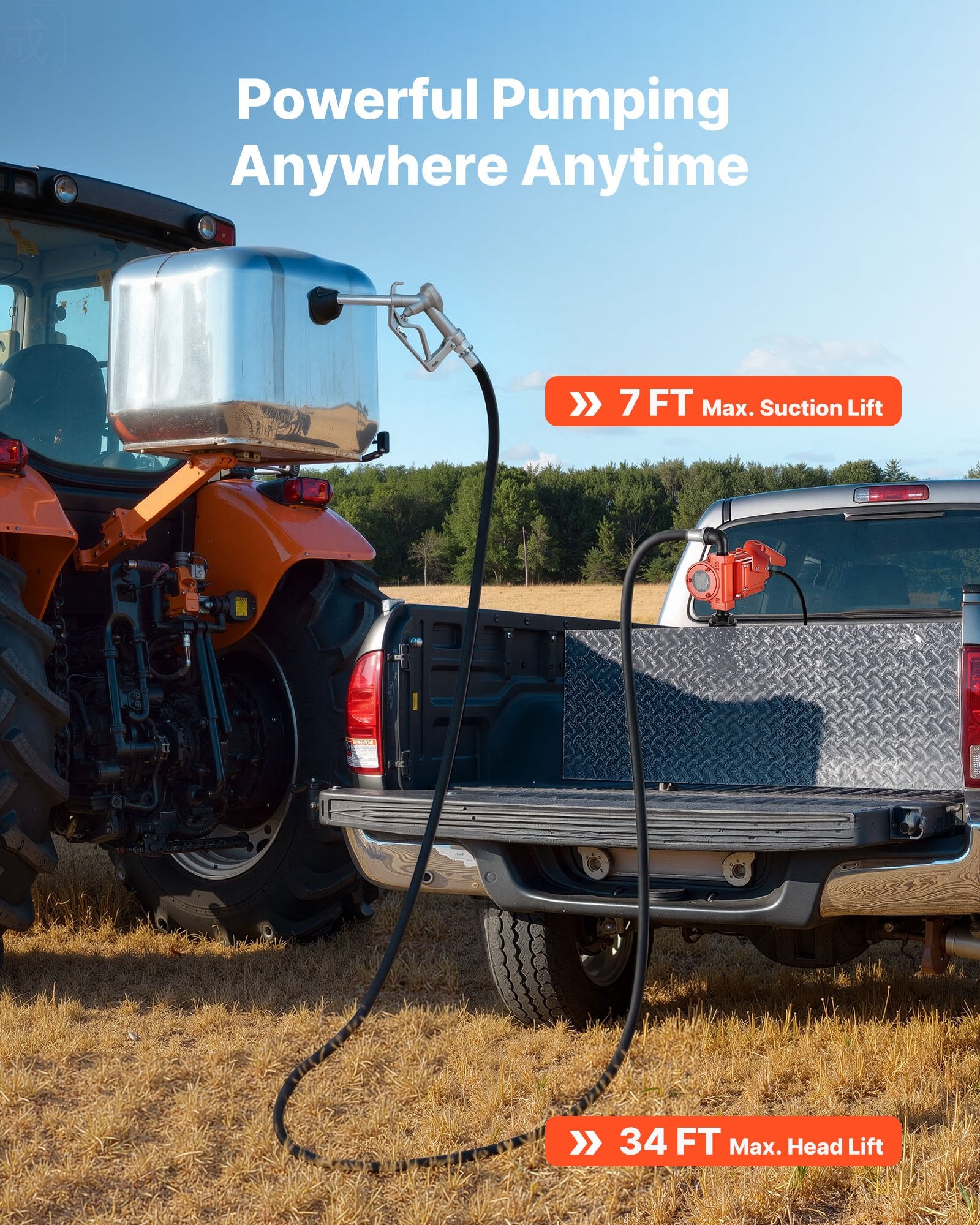 - Efficient Fuel Delivery: Delivers up to 15 GPM with a 4900 RPM motor, 34 ft max head lift, and 7 ft suction lift. Our 12V fuel transfer pump handles gasoline, diesel, and kerosene for fast, versatile transfers