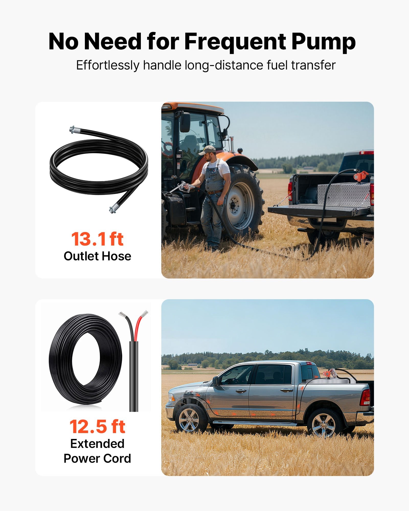 - Complete Kit Included: This 12V gasoline transfer pump comes ready to work with a 13 ft outlet hose, 14–37 inch adjustable suction pipe, and power cable with alligator clip. Everything you need for efficient, hassle-free refueling on the job