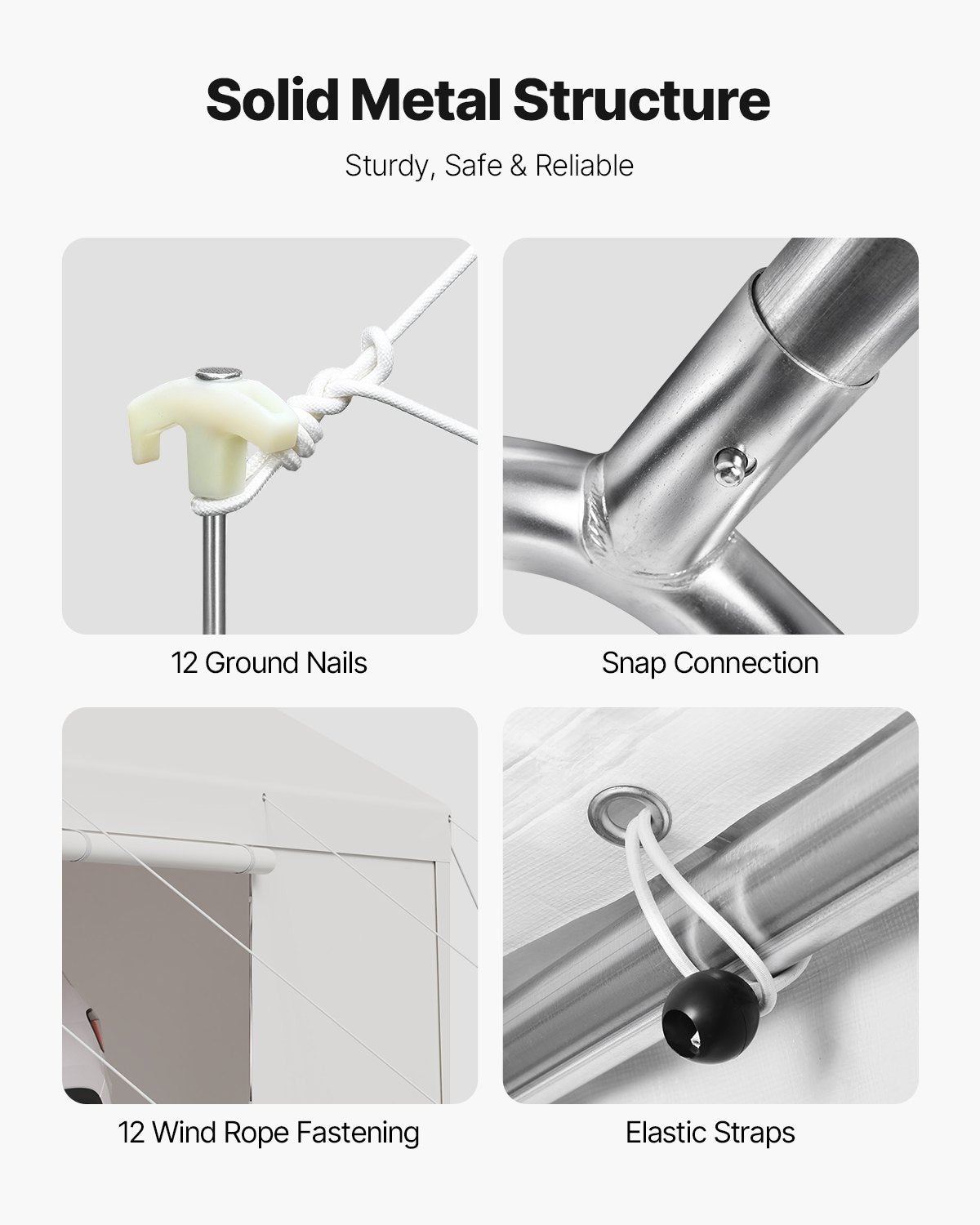 - Strong and Durable Materials: Made with galvanized steel pipes, the frame resists rust. The car canopy comes with alloy steel frame that is stronger and more durable than regular steel, able to withstand higher wind pressure and heavier weight, ensuring long-lasting use. Equipped with wind ropes and ground stakes for added stability in windy conditions.