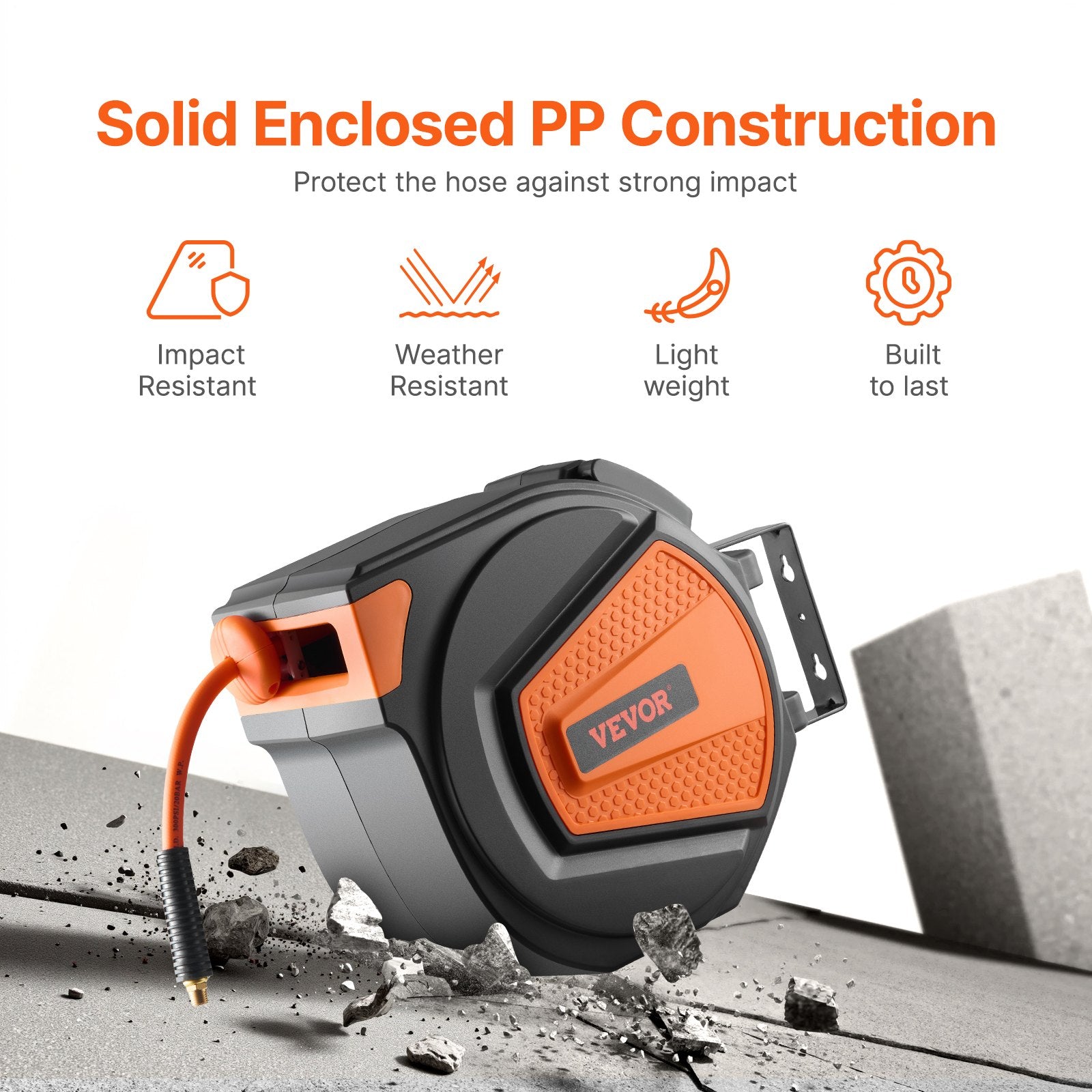 - Sturdy Construction: This enclosed retractable air hose reel is made of lightweight yet durable polypropylene, offering excellent weather and impact resistance. The internal connectors are sealed with anaerobic sealants to prevent air leakage. It can be securely mounted to ceilings, walls, or any solid surface.
