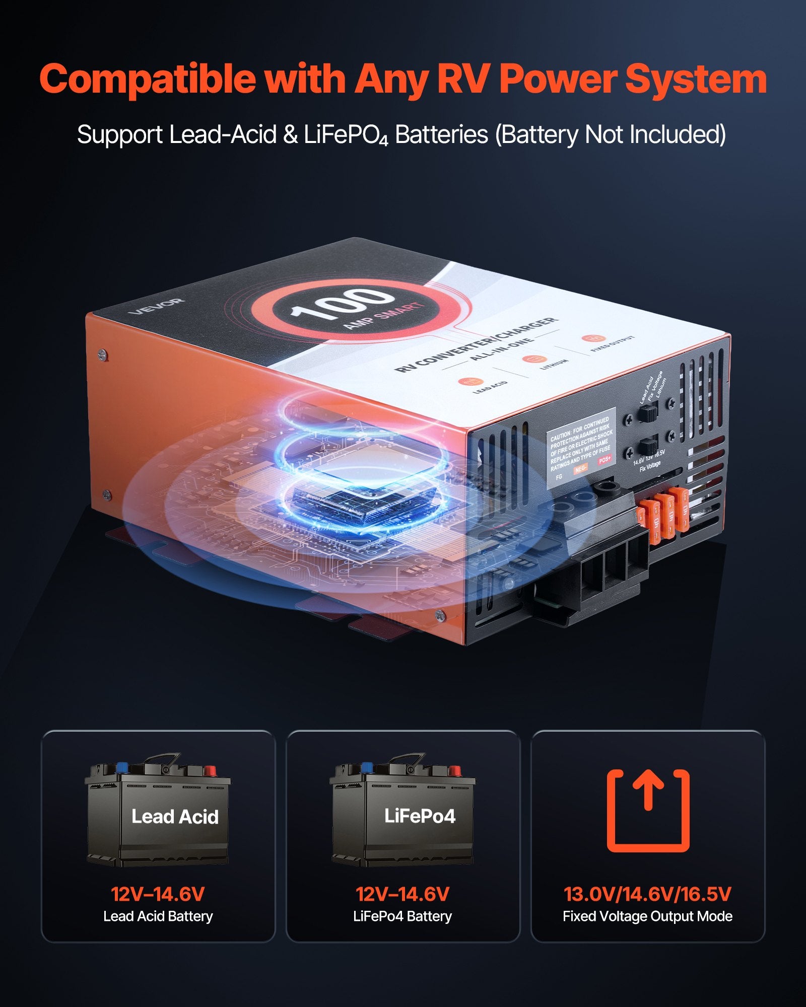 - 100 Amp High Performance: Delivers up to 100A clean and consistent current. Our RV converter charger powers your essential RV electronics, such as lights, speakers, and more. Suitable for large-capacity RV batteries rated 75Ah–80Ah