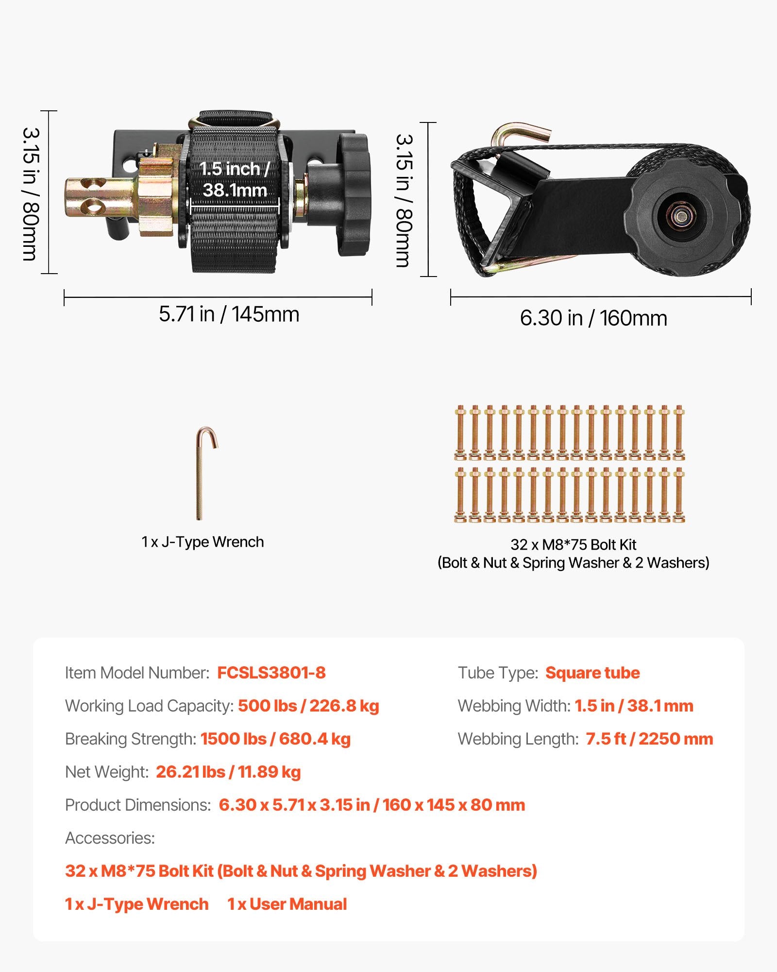 Ladder Rack Ratchet Straps, Black Square Tube Mount, 1.5 in Wide x 7.4 ft Long Black Ladder Rack Straps with Double J-Hooks, 500 lbs Load Heavy Duty, Cargo Buckle Lock Strap (8 Pack)