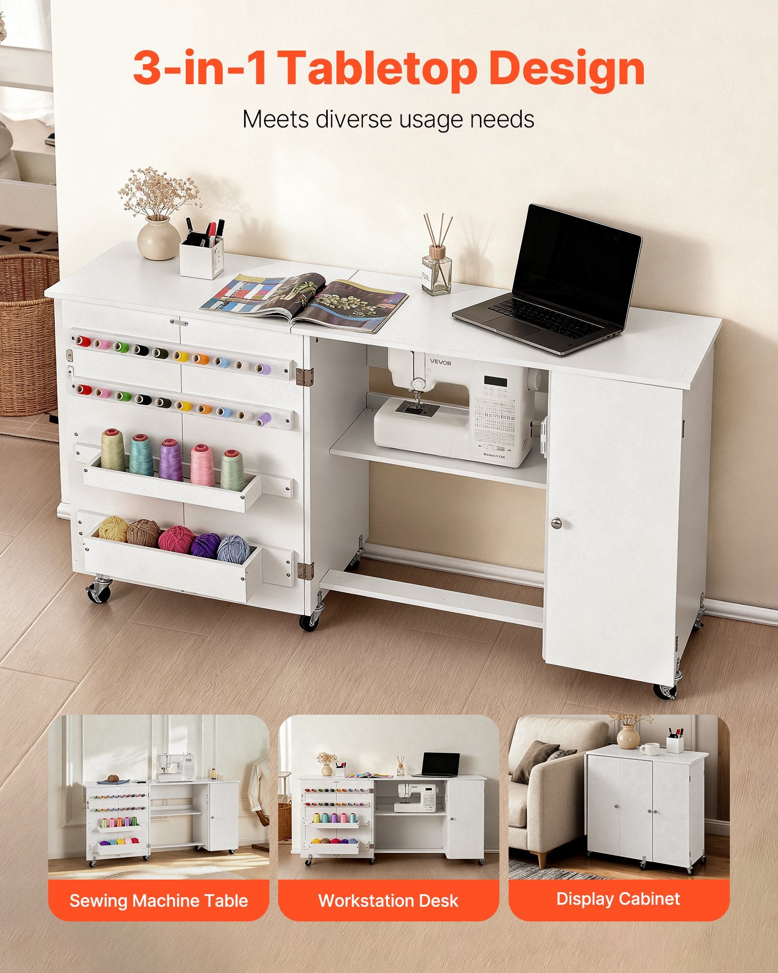 - Foldable Design: Our sewing machine table features a flexible foldable design that provides a spacious working area when unfolded. When not in use, it folds into a compact side cabinet that takes up little space and fits in any corner for storage