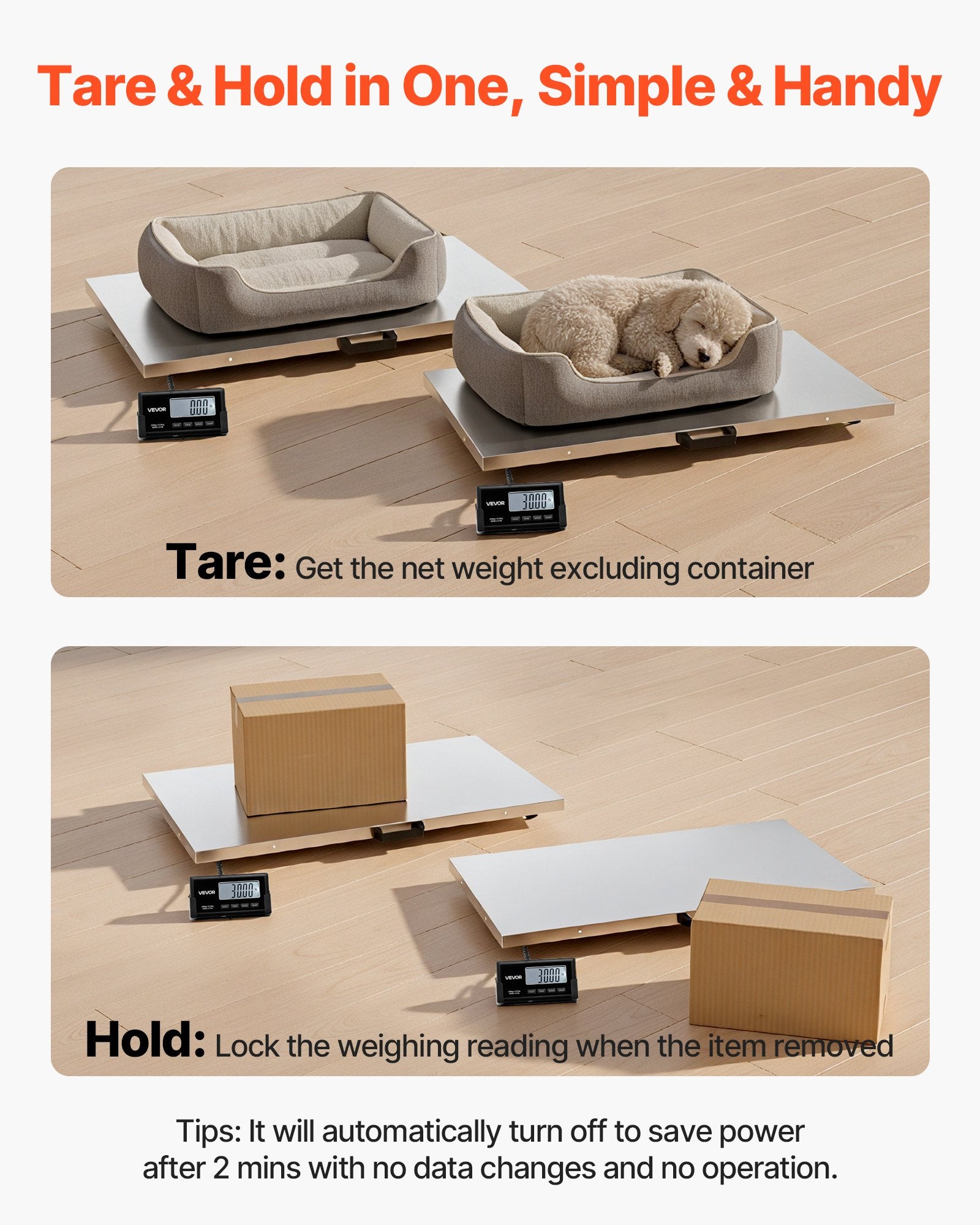 - 2-in-1 Tare & Hold: The tare function of the mailing scale quickly deducts container weight, while the hold mode freezes the reading—ideal for large packages that block the display