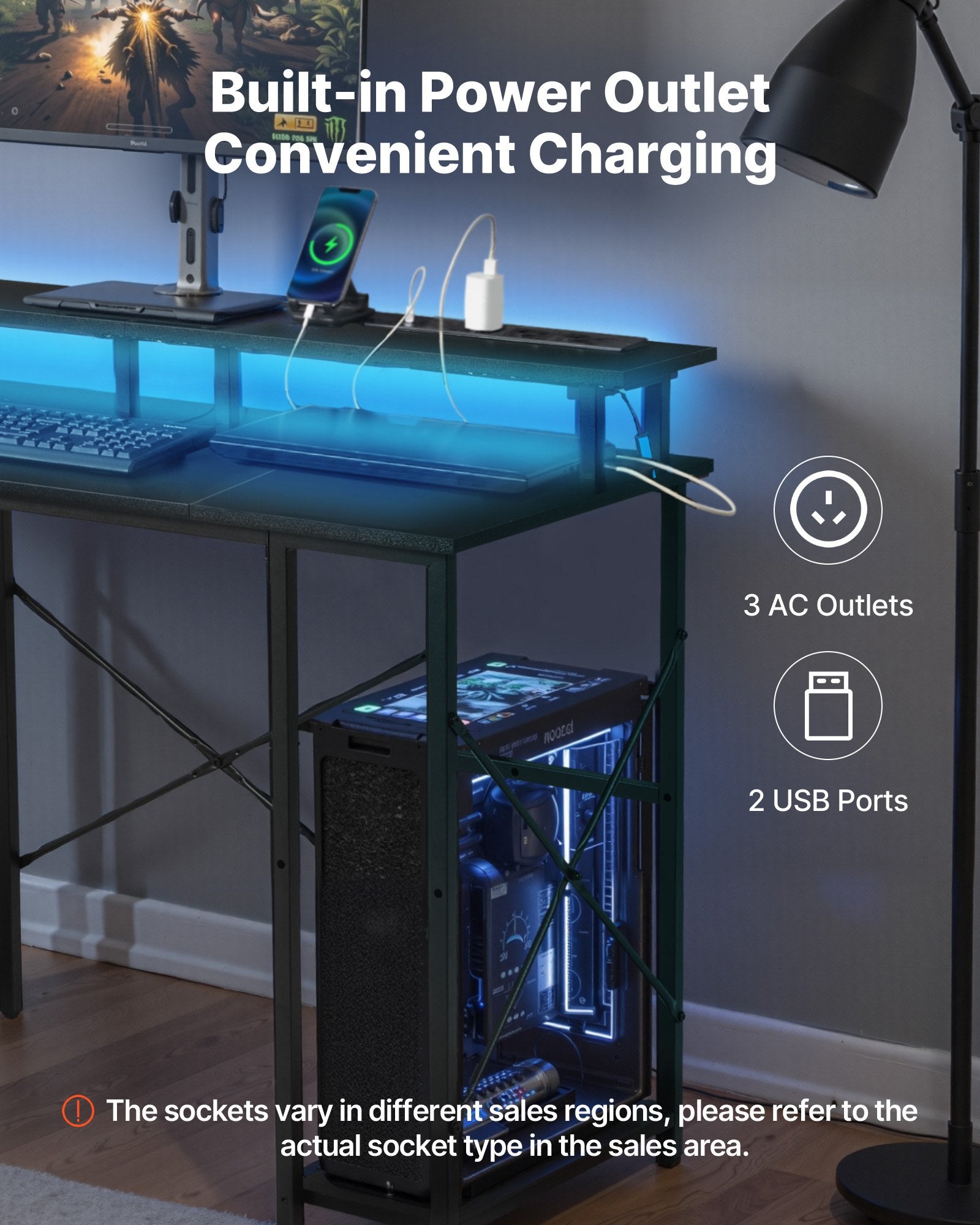 47" Gaming Desk with LED Lights & Power Outlets, Computer Desk with Monitor Stand & 2-Tier Storage Sheves, Study Work for Home Office, Black