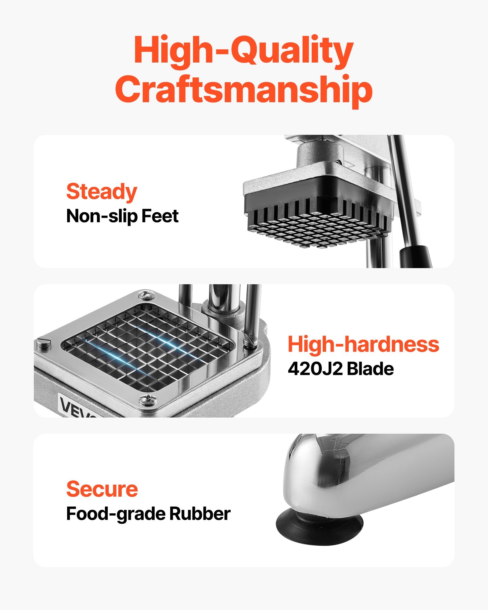 - Upgraded Blades: This French fry cutter features food-grade 420J2 stainless steel blades in 1/4", 1/2", and 3/8" sizes. Easily cuts potatoes, carrots, cucumbers, and more. For hard food like sweet potatoes, microwave them first for smoother cuts