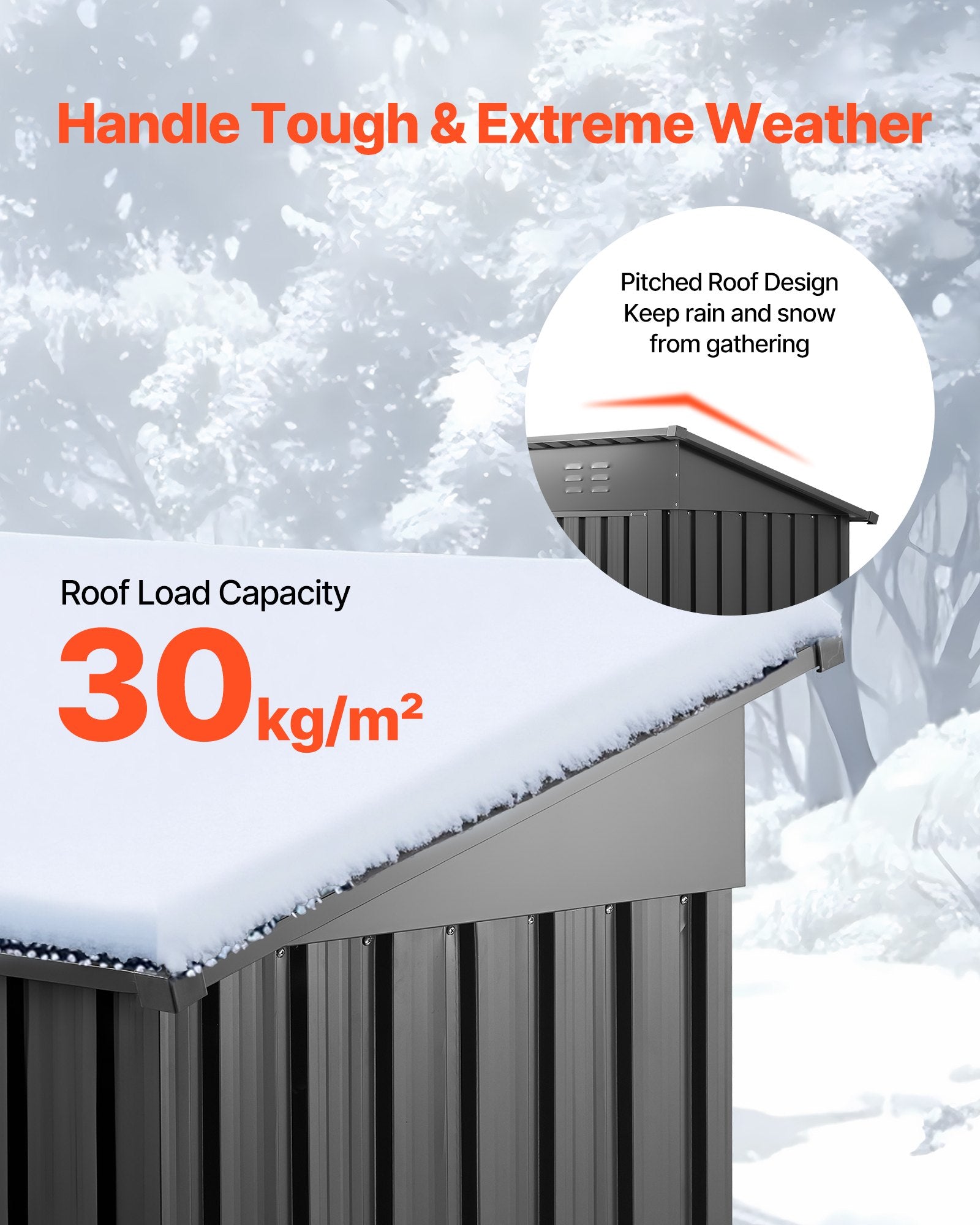 - Snow & Water Resistant: VEVOR garden shed features a sloped roof that helps avoid snow and water buildup. With a maximum load capacity of 30kg/m², it is built to withstand heavy snow, water, or debris. Enjoy a long-lasting and sturdy outdoor storage solution