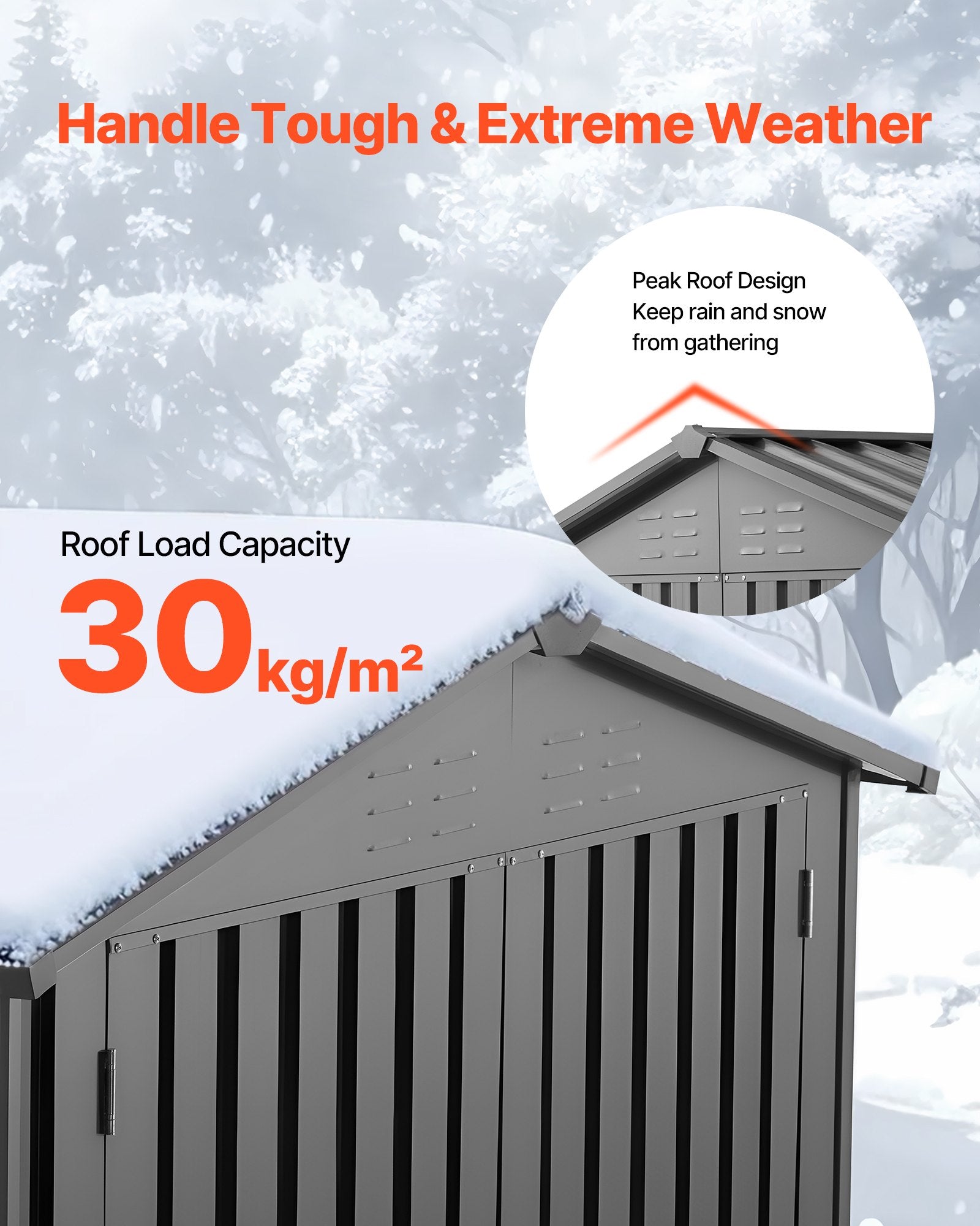- Snow & Water Resistant: Designed with a peaked roof, this garden shed helps avoid snow and water buildup. It can support up to 30kg/m², ensuring the roof stays intact despite heavy snow, water, or debris. Built for long-term durability, it remains stable and reliable for outdoor use
