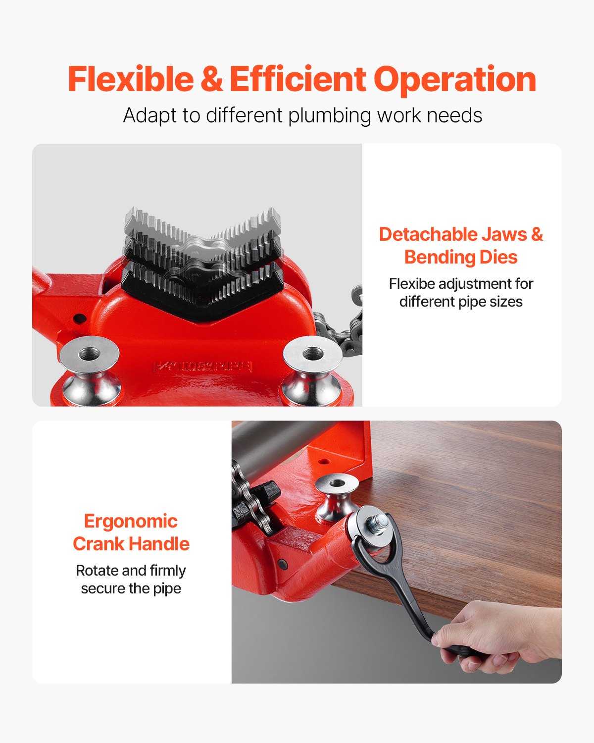 - Flexible Operation: Featuring detachable jaws and bending dies, this pipe vise meets different plumbing work needs. The ergonomic crank handle enables precise control of chain tightening, greatly enhancing work efficiency.