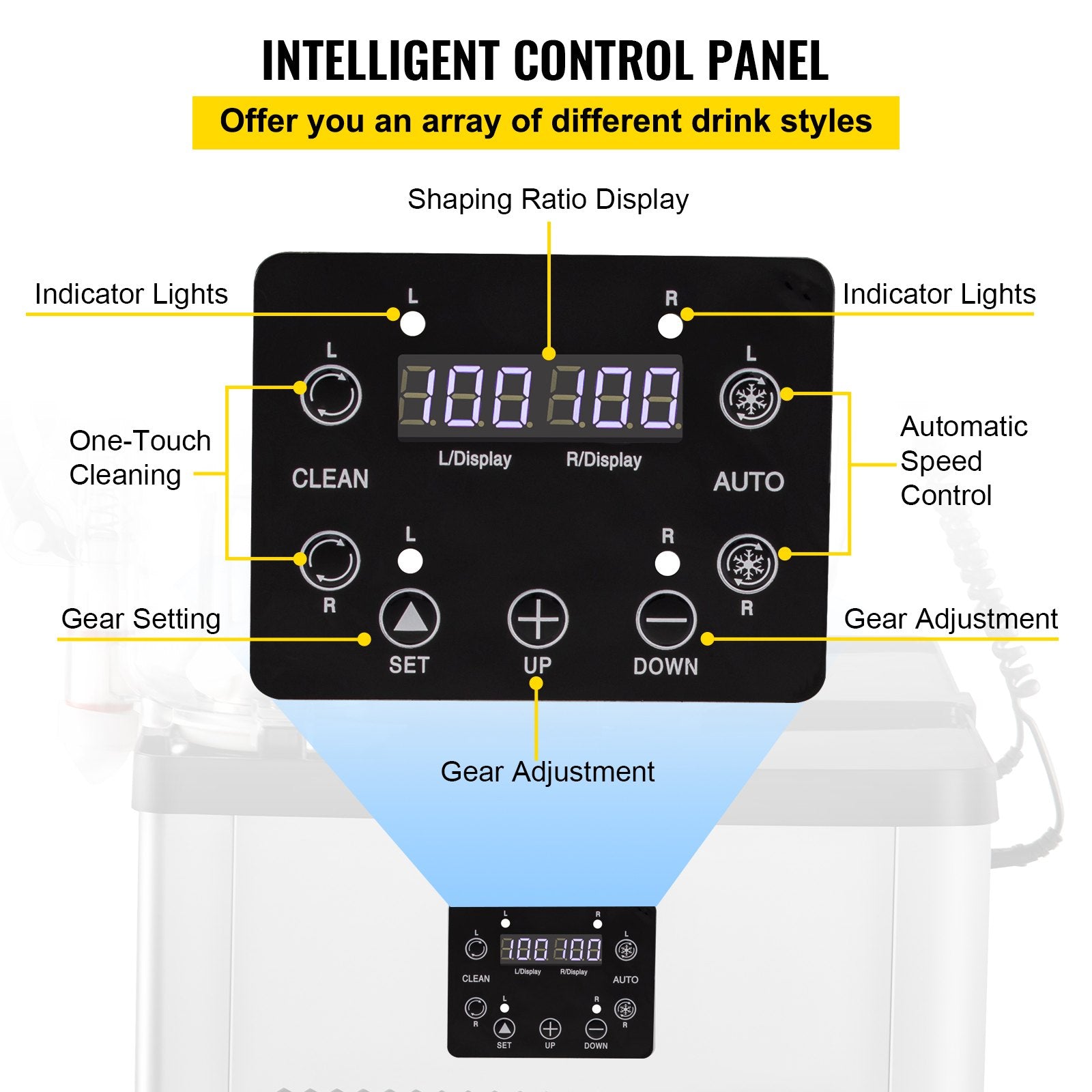 - Precise Control Area: A brief control panel promises ease of use for the commercial slushie machine, and each bowl operates independently. With a simple one-touch operation, you will have your favorite frozen drink ready to slurp. Two digital displays make shaping ratio status clear at a glance. The automatic cleaning mode is also available to save effort.
