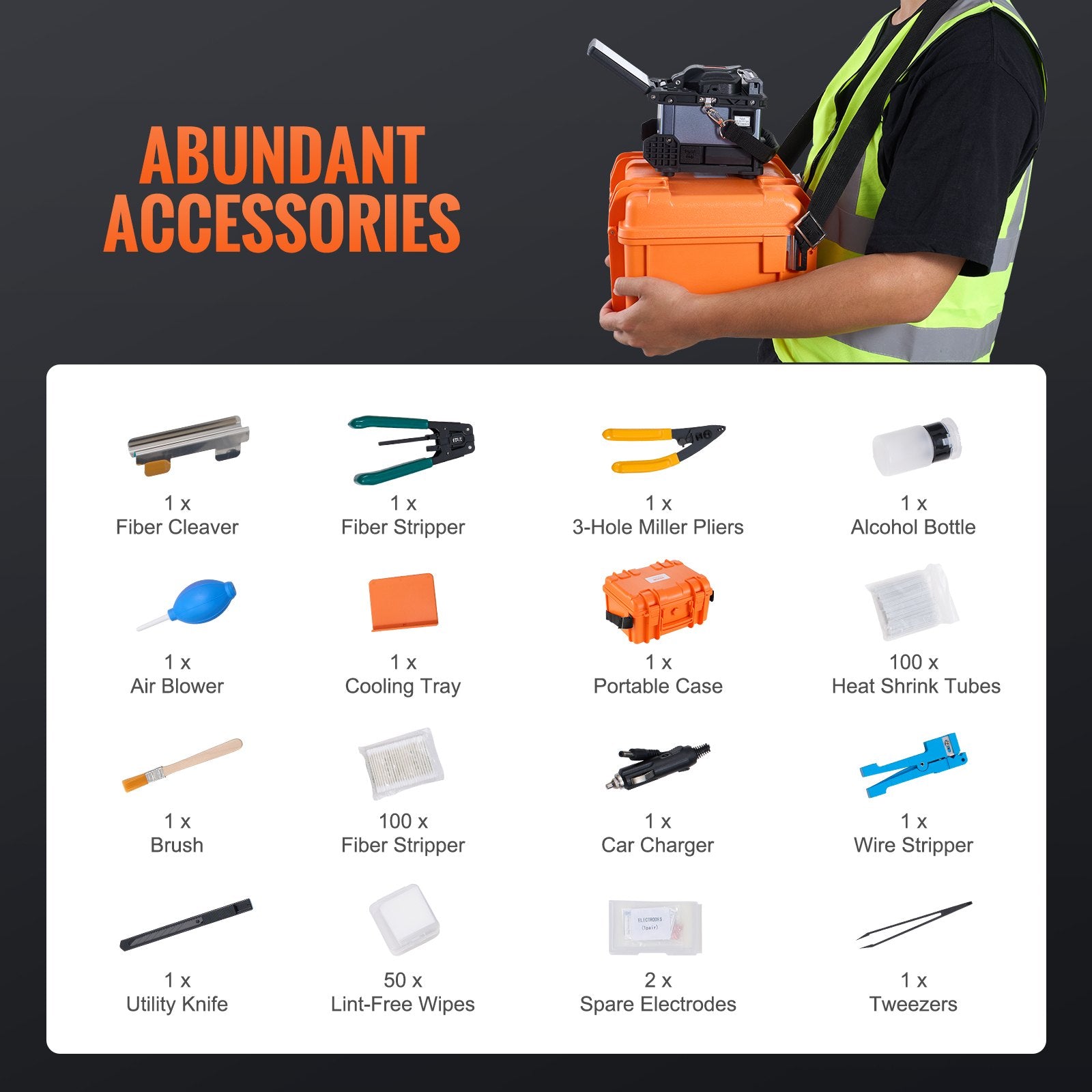 - Professional All-in-One Kit: Keep your accessories neatly organized with the portable case. The optical fusion splicer kit includes a fiber fusion splicer, fiber cleaver, fiber stripper, 3-hole miller pliers, alcohol bottle, air blower, cooling tray, heat shrink tubes, brush, cotton swabs, and other essential tools.