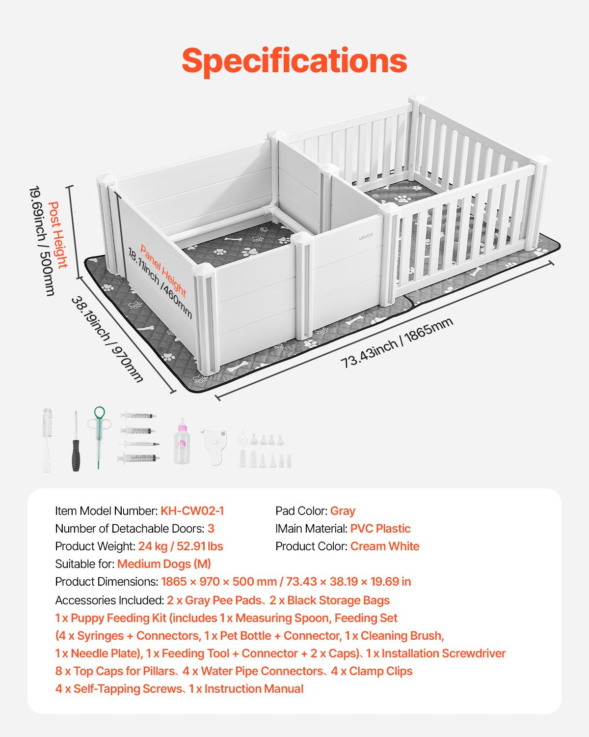 - Durable and Long-lasting: Made of high-quality PVC material, this dog whelping pen is waterproof, rust-resistant, and designed to withstand long-term use without deformation or aging. The flat panel design makes cleaning easy, creating a healthy, secure, and stable environment for your pet.