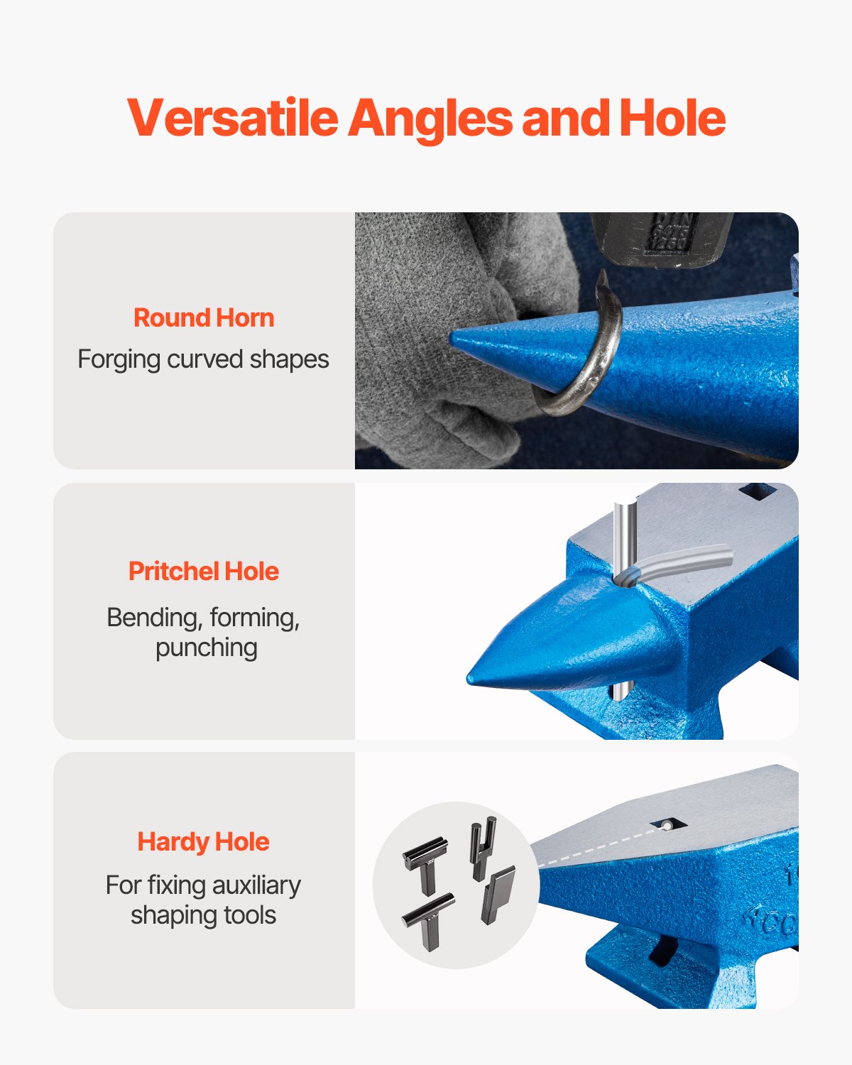 - Holes & Horns for Different Uses: Round horn and the flat horn of the anvil blacksmith are used for smoothing, bending, and shaping. And the hardy hole and pritchel hole can show a good performance in accessories’ punching and twisting.