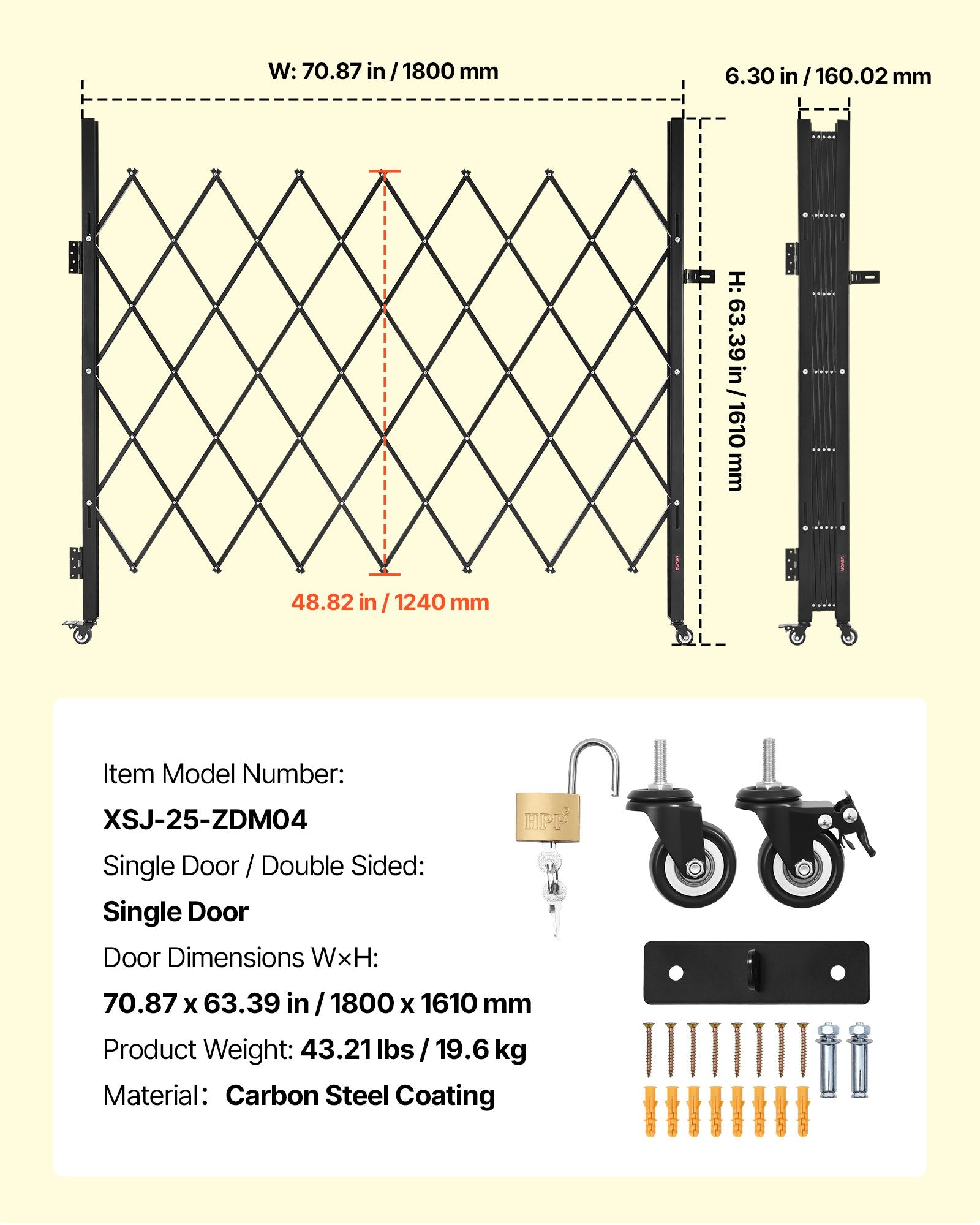 Single Folding Security Gate, Lockable Scissor Gate with 360° Swivel Casters, Outdoor Barricade Steel Retractable Gates, for Entry Security, Garage, Warehouse & Pool, 70.87 x 63.39 in (W x H)