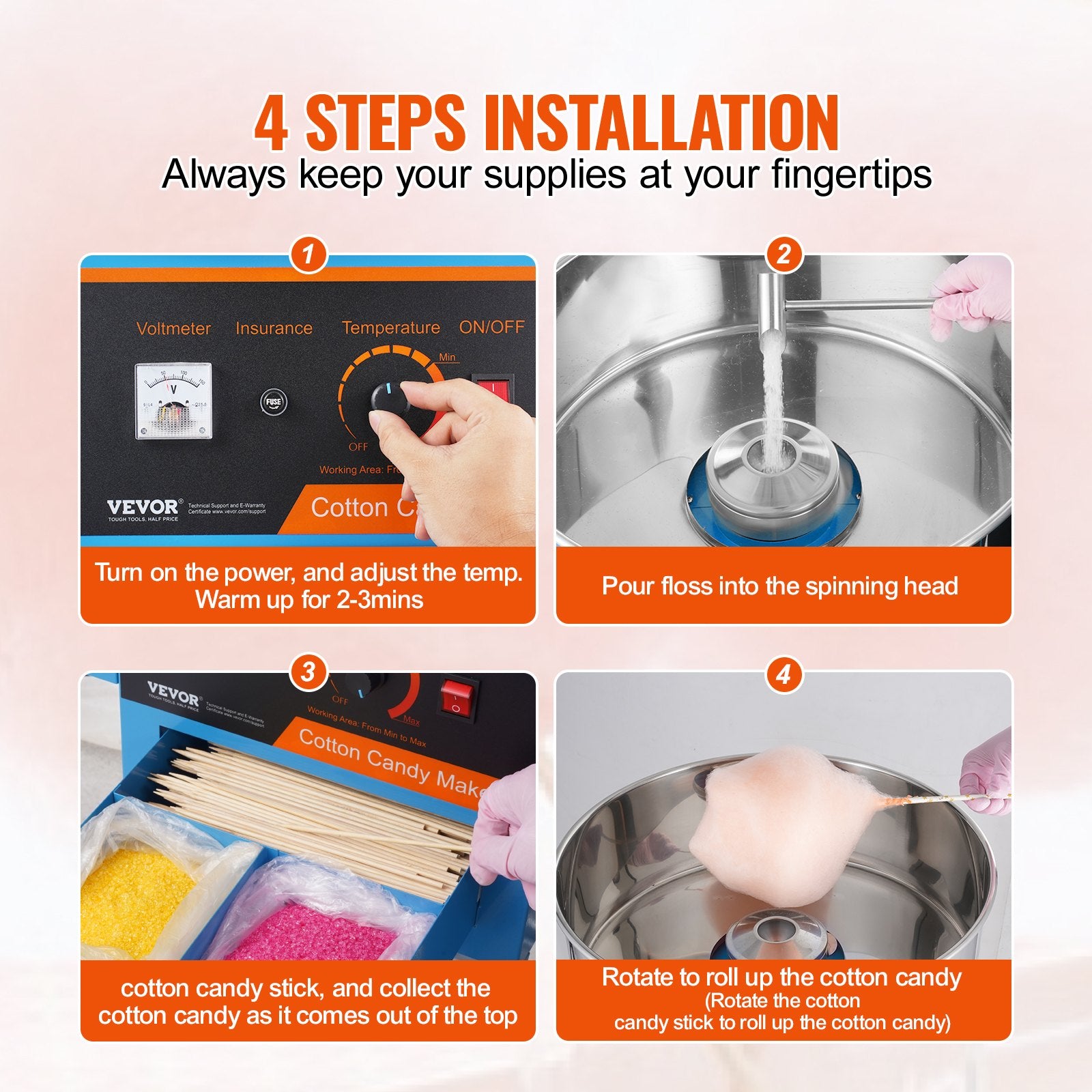- Easy-Operating Process: Using this machine couldn't be easier. Turn on the power, adjust the temperature, warm up for 2-3 minutes, and pour sugar into the spinning head, and then you just need to use the sticks to collect the cotton candies from the head.