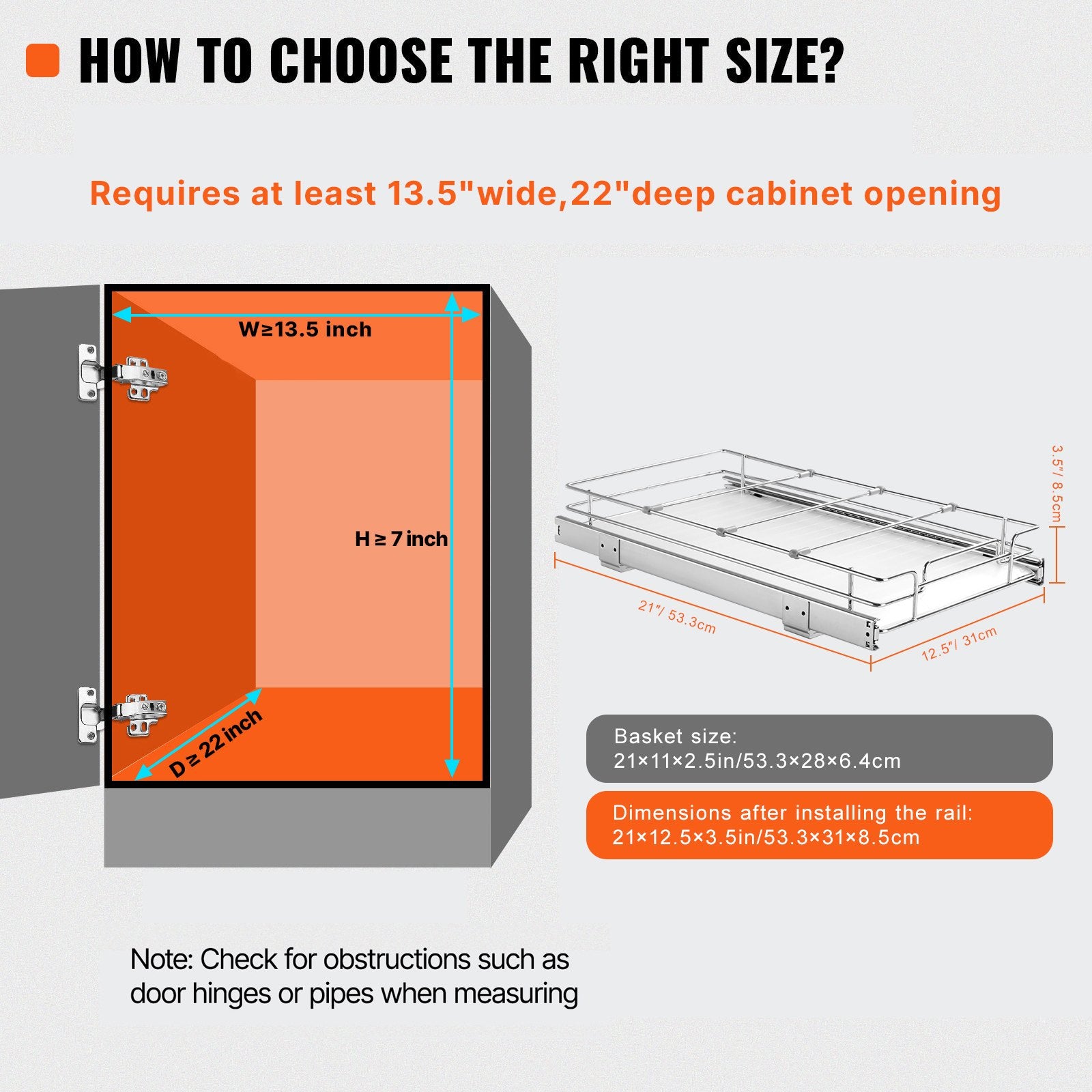- Convenient and Practical Storage Solution: Product Size: 11"Wx21"Dx2.5"H; Cabinet Installation Size: 13.5"Wx22"Dx7"H. Note: Check for obstructions such as door hinges or pipes when measuring. Our pull out cabinet shelf can create larger storage space in a small cabinet; you can use it in any cabinet. You can place pots and pans, seasoning jars, food jars, cleaning supplies, spice racks, and other items, significantly saving your storage space.