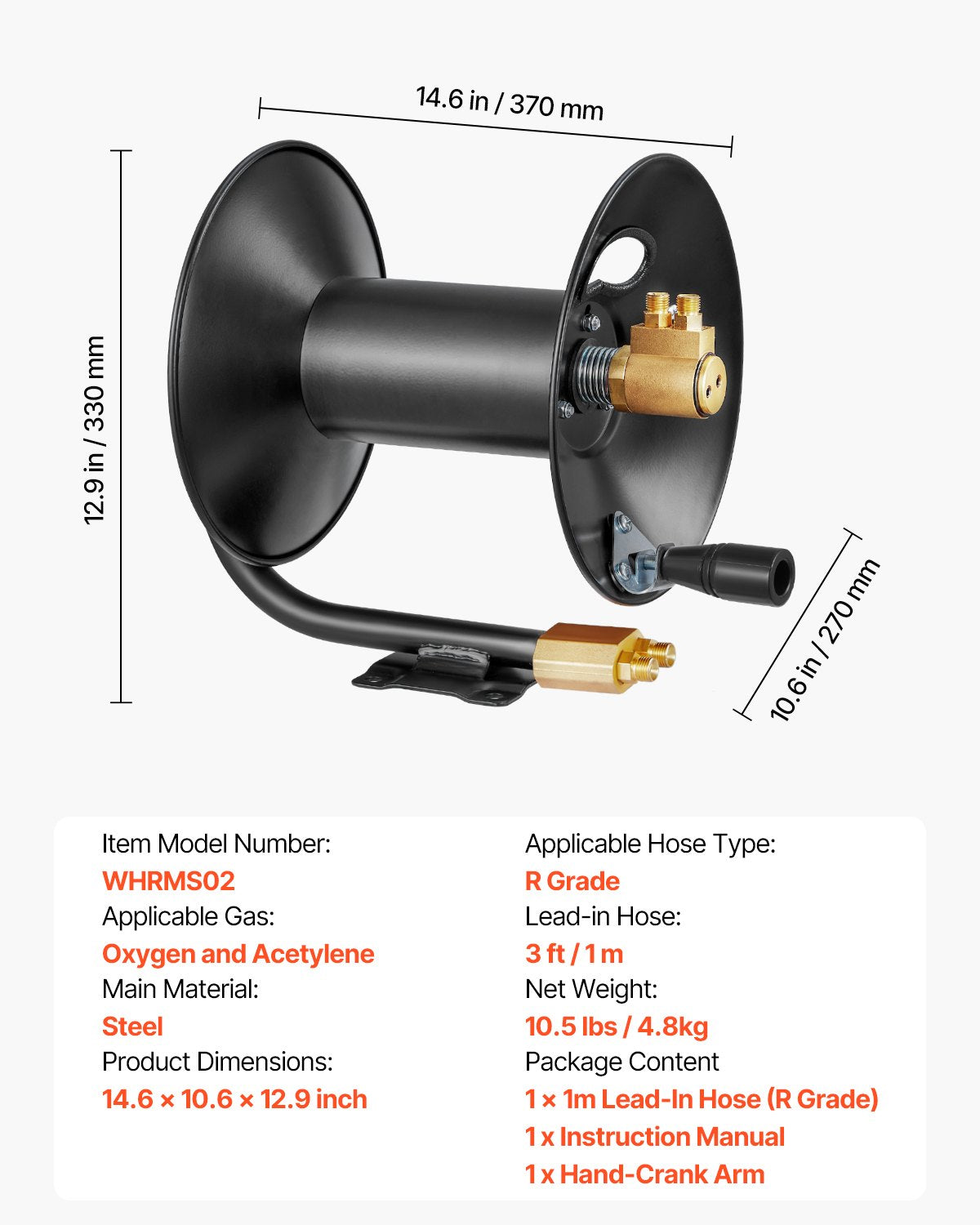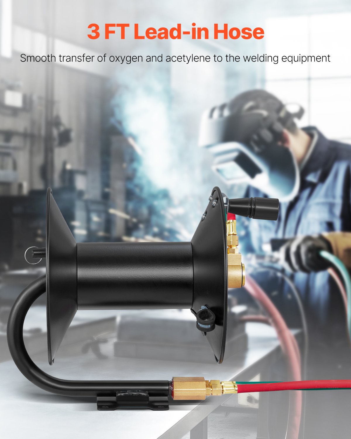 - Compatible with R-Grade Hose: This welding hose reel comes with a 3ft (1m) lead-in hose, ensuring smooth transfer of oxygen and acetylene to welding equipment. Equipped with 9/16"-18 LH / RH B fittings, it ensures secure and reliable connections. (NOTE: The Welding Hose is Not Included.)
