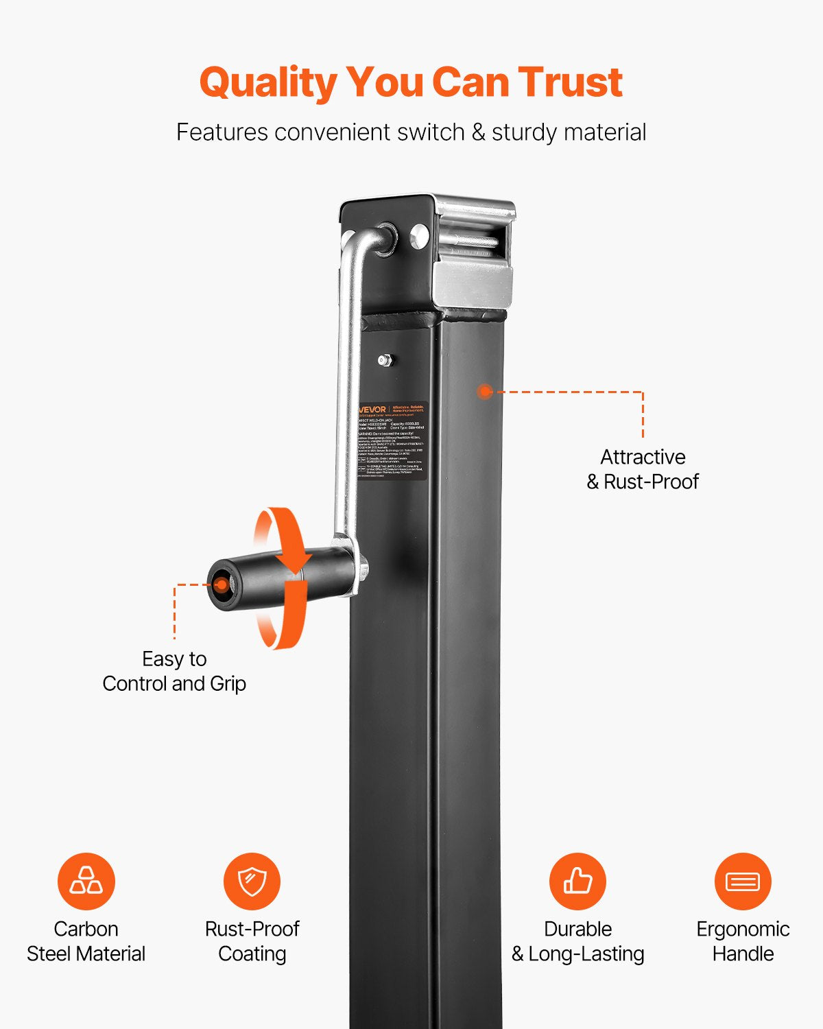 - Reliable and Durable: This trailer tongue jack is made of tough alloy steel with a rust-resistant, powder-coated finish. It's ready for anything, standing up to all kinds of environments without giving in to rust.
