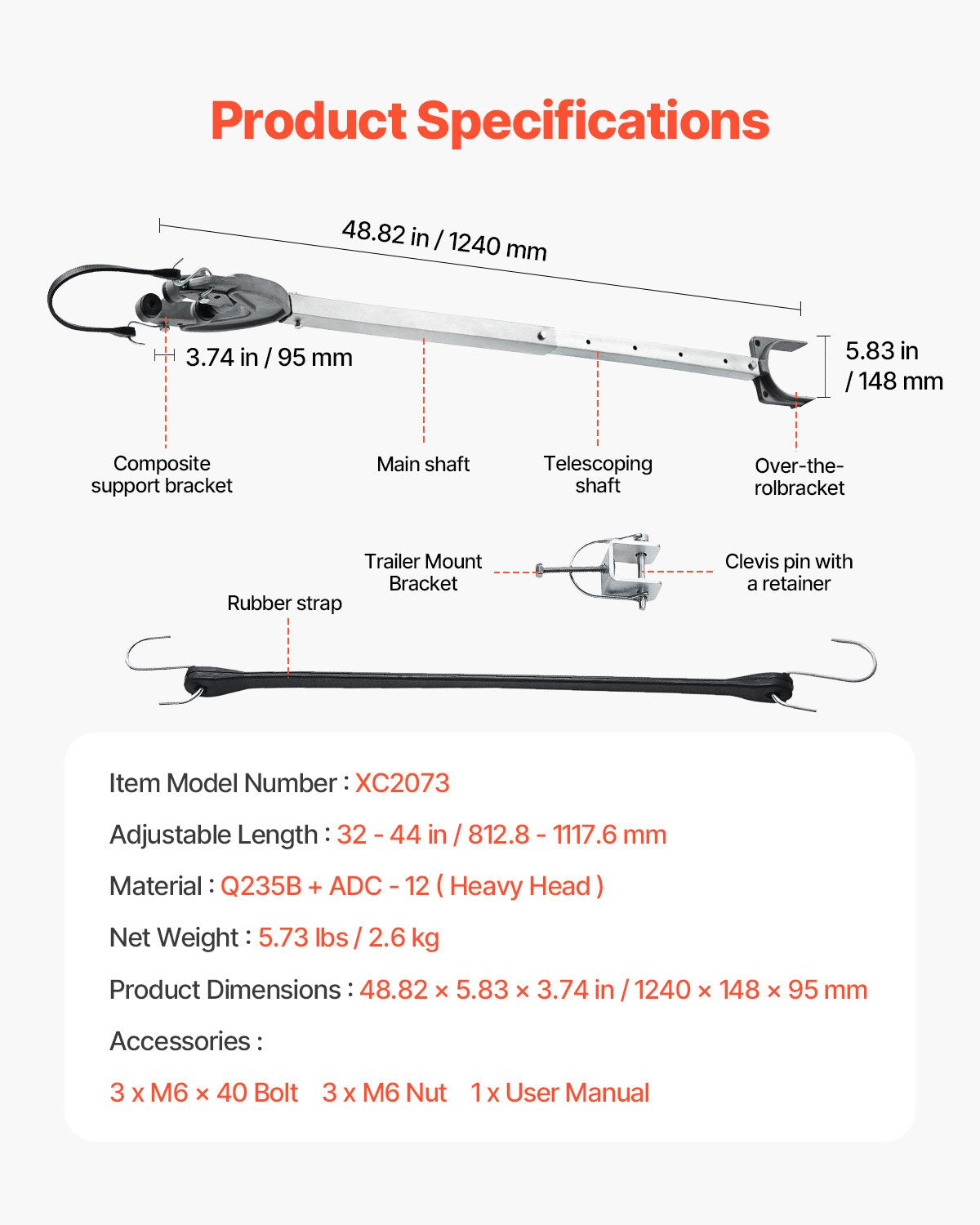 - Adjustable Length: 32-44 in/812.8-1117.6 mm