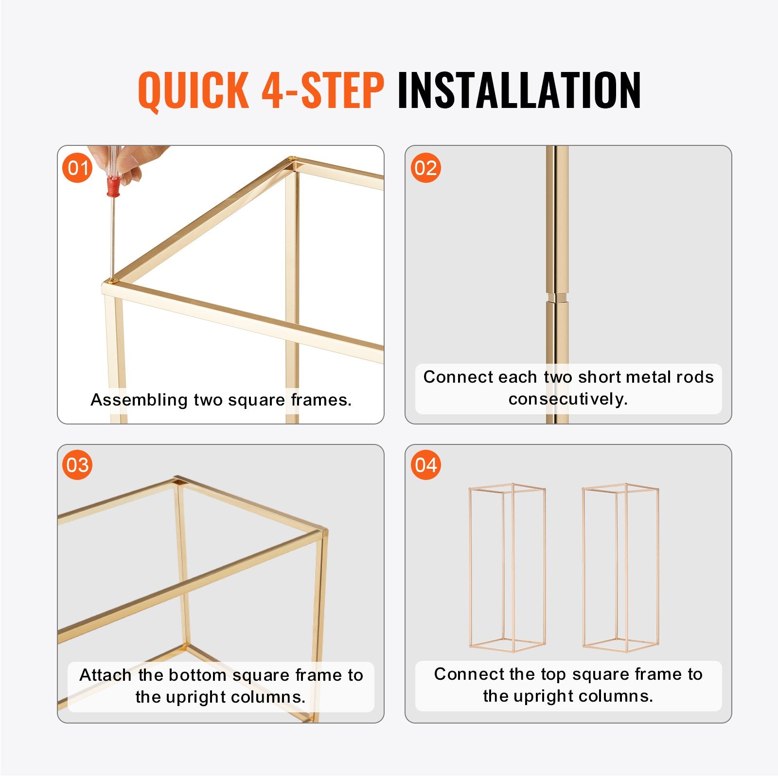 - Easy Assembly: Assembly of this wedding flower stand is a breeze and requires no tools. Simply follow these 4 steps. Step 1: Start by installing the two square frames. Step 2: Assemble the two smaller metal rods one by one. Step 3: Connect the bottom square frame to the columns. Step 4: Connect the top square frame to the columns. You can complete the assembly in just a few minutes.