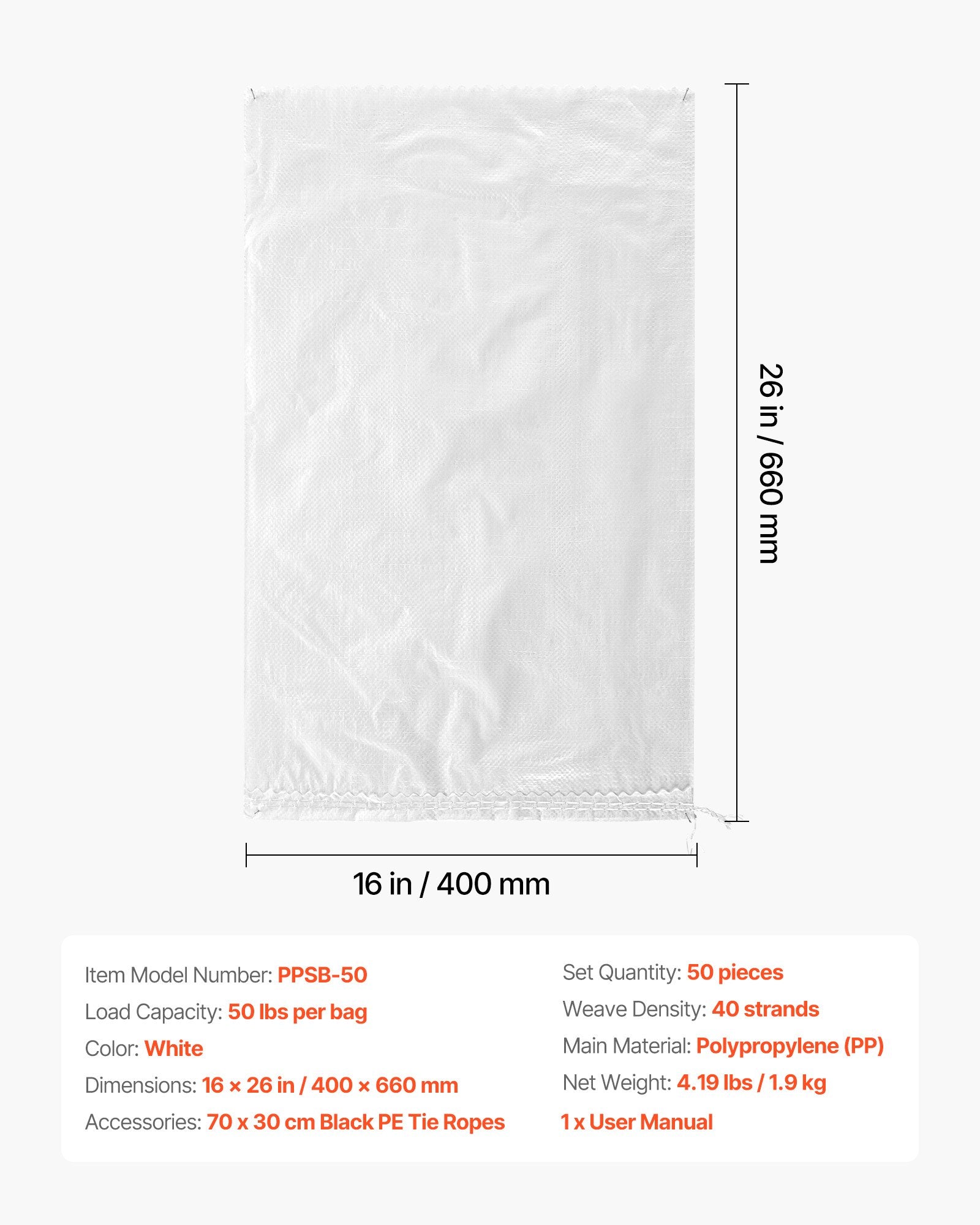Heavy Duty Sand Bags, 50Pack 14" x 26", Empty Sandbags for Flooding with Tie Strings, Woven Polypropylene Sand Bag with 1600 Hours of UV Protection, 50Lbs Capacity